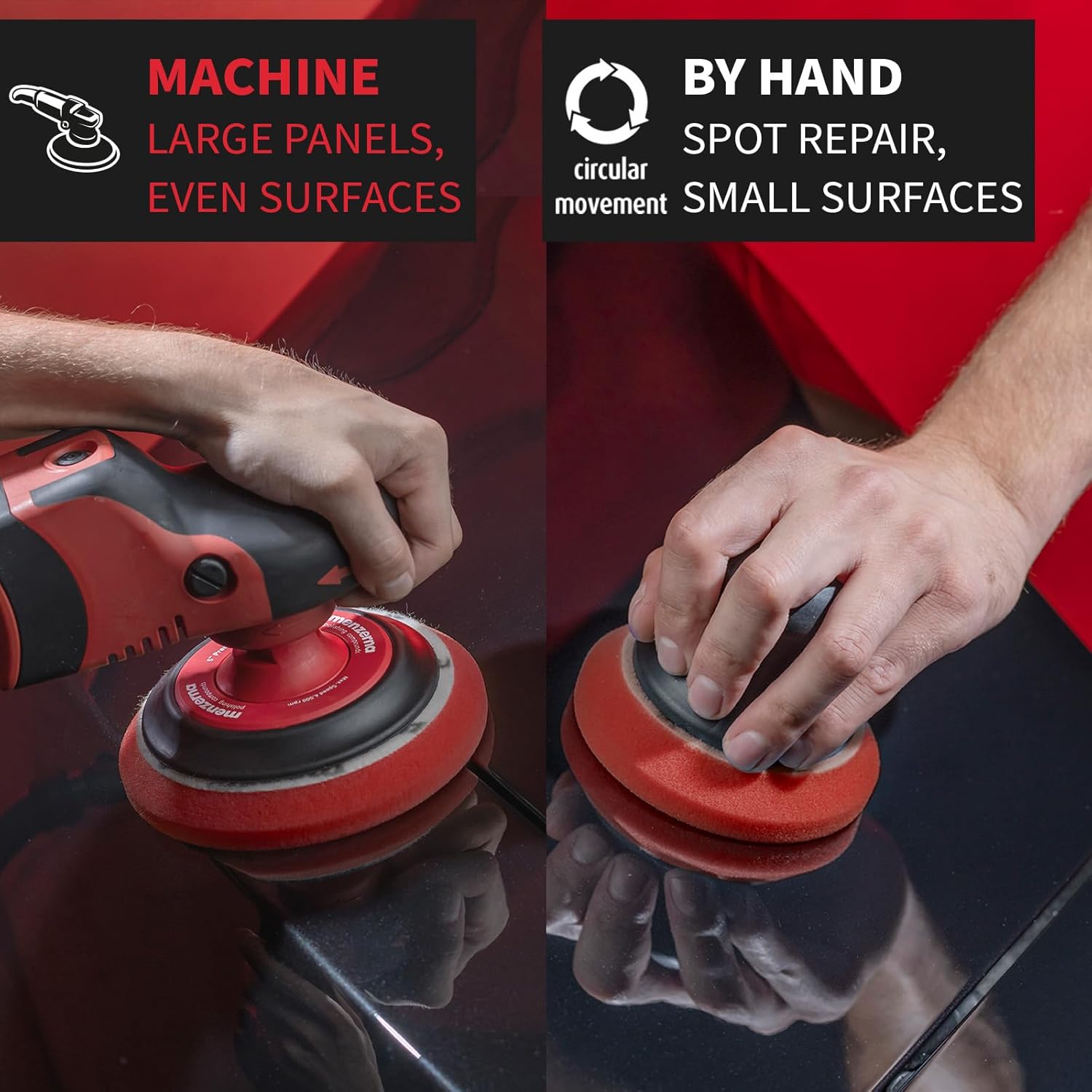 BEGINNER FRIENDLY: Clean the surface with the Menzerna Control Cleaner. Apply 3-7 drops of polish to the red Heavy Cut Foam pad. Polish until the greasy looking film looks slightly translucent and remove polish residues. Take a second stage of polishing with the Cut Force Pro with the green Soft Cut Pad. Follow Up with the Menzerna Power Lock Sealant.
