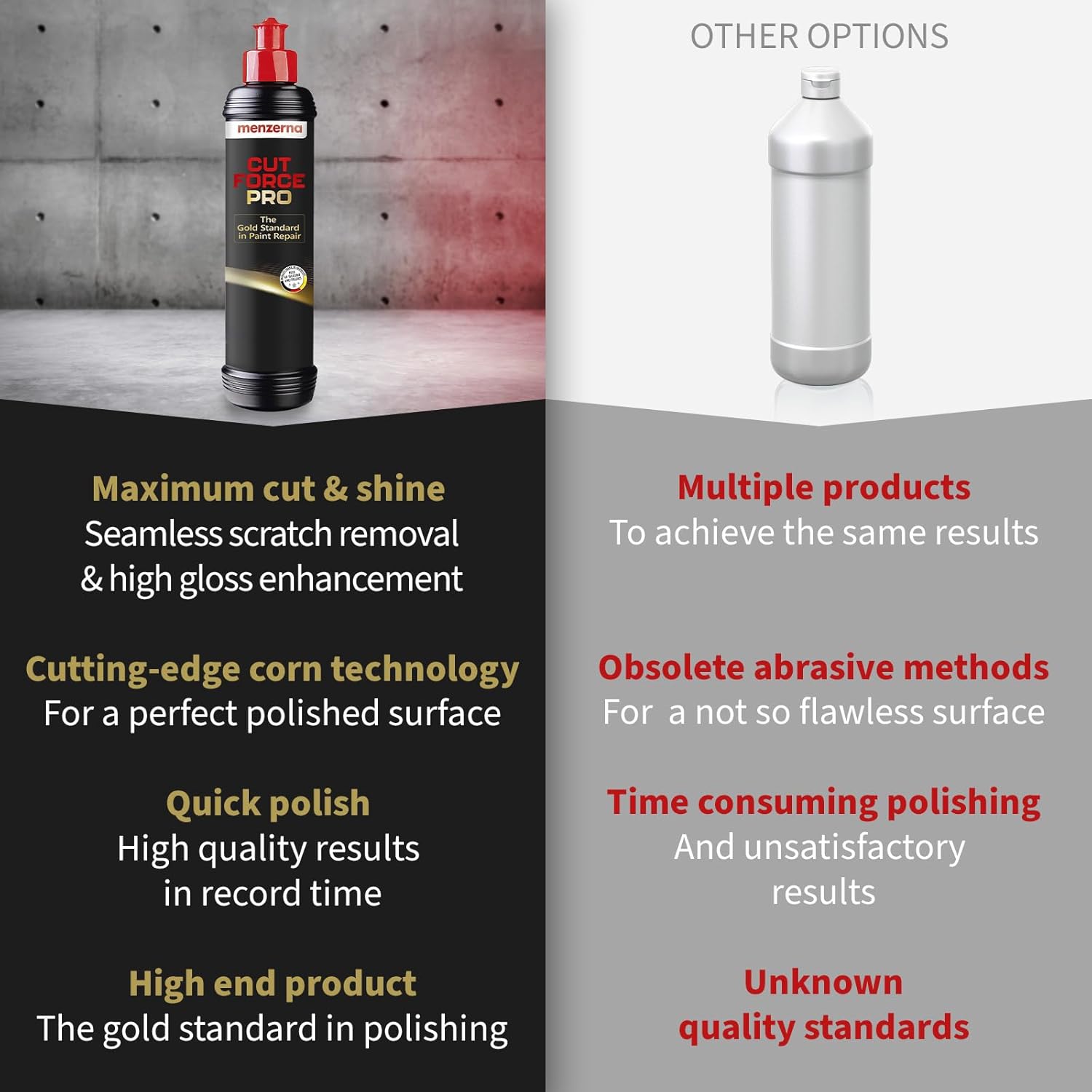BECOME A CUT FORCE PROFESSIONAL: Our Menzerna Cut Force Pro is compatible with our red Heavy Cut or our green Soft Cut Pad. By using an orbital or rotary polishing machine or polishing it by hand, your vehicle will be as shiny as it can get!