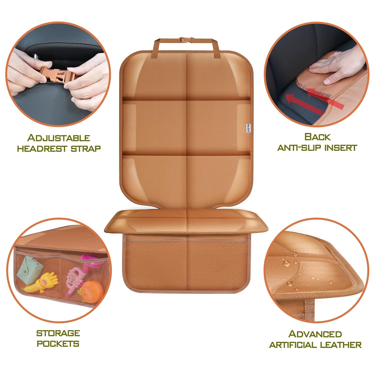 I bought this seat protector for under my child’s car seat, and it’s been one of the best little investments I’ve made for keeping my car clean and damage-free. It fits great, doesn’t slide around, and wipes clean in seconds—exactly what every parent or rideshare driver needs!⸻🔍 Key Features & My Impressions:🛡 Protection & Durability (5/5)• Made of thick, waterproof material that protects against spills, crumbs, dents, and dirt from car seats or booster bases.• After a few weeks of daily use, there’s zero wear or slipping—even under a heavy convertible car seat.🧷 Non-Slip & Secure Fit (5/5)• The textured surface and adjustable straps keep it firmly in place, even with a wiggly toddler climbing in and out.• It fits snugly in both my SUV and my partner’s sedan.🧼 Easy to Clean (5/5)• Spilled juice? Cracker crumbs? No problem—just wipe with a damp cloth.• The material doesn’t stain easily, and the stitching holds up great after several cleanings.📦 Bonus Features (4.5/5)• Love the front mesh pockets for snacks, wipes, or small toys—it keeps essentials within easy reach.• It’s also great for protecting leather seats from car seat pressure points.⸻✅ Pros:• Thick, durable, waterproof design• Non-slip grip keeps it secure under car seats• Universal fit—works in most cars• Front pockets for extra storage• Easy to wipe clean❌ Cons:• May be a tight fit in very compact cars (but still usable)⸻💬 Final Thoughts:This protector does exactly what it promises—keeps your seats clean, protected, and organized, especially if you have kids, pets, or a car seat installed full-time. It’s affordable, sturdy, and has already saved me from at least three messy cleanups.Would I buy it again? Yes—already ordered a second for the other car.Would I recommend it? Absolutely—for parents, pet owners, or anyone who wants to keep their car looking new.