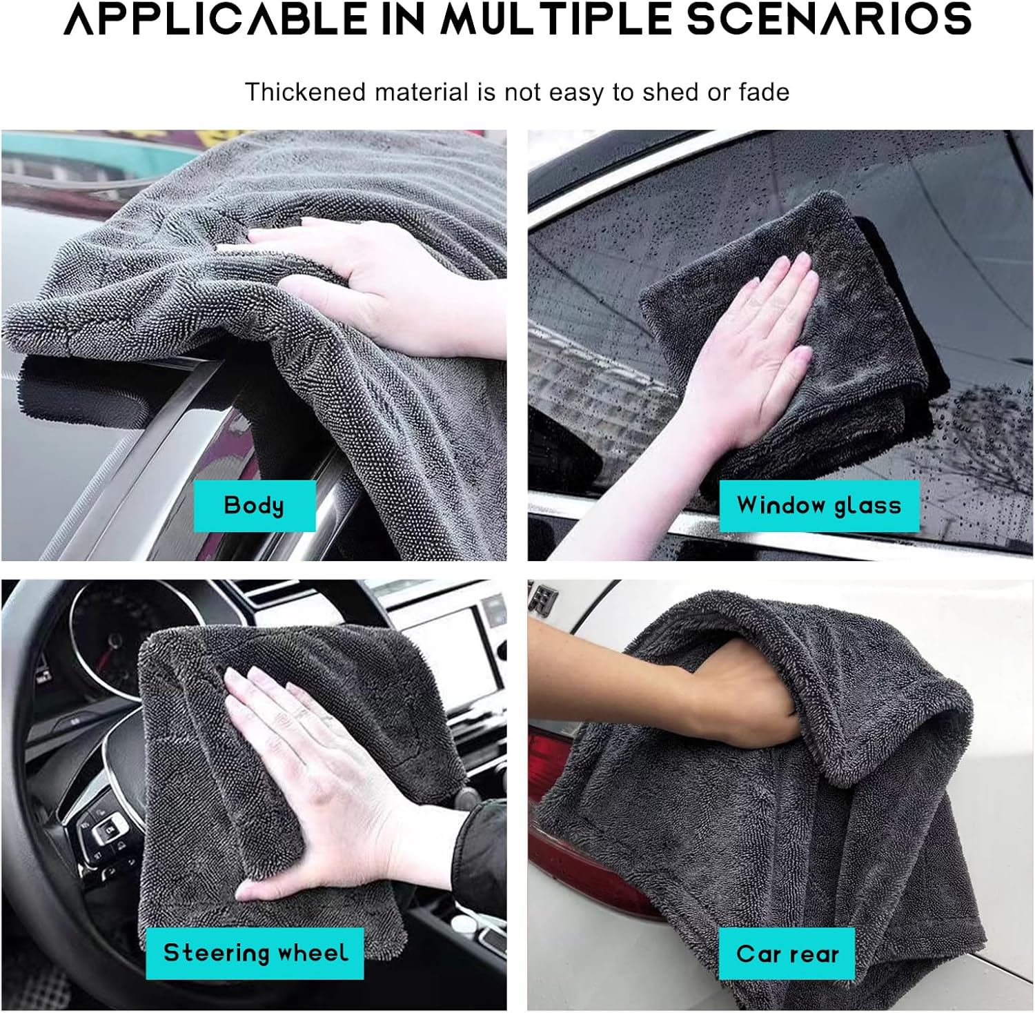【Broad Application】: The premium microfiber towels are suitable for a wide range of car care activities, from cleaning and drying to detailing and polishing. Apart from that, you can also use them for household cleaning, such as wiping down countertops, tackling spills, and cleaning mirrors and windows.