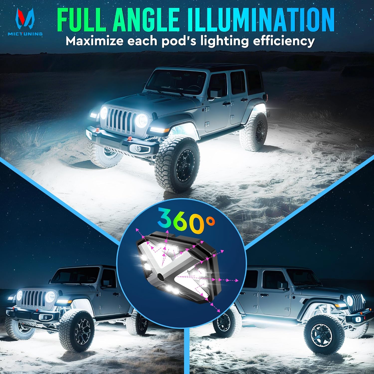 Unique 360° Ultra-Bright Illumination Design – Featuring 180° ultra-wide beam angles and 360° horizontal illumination, provides 2x wider beam spread than standard rock lights for maximum visibility and ultra-efficient lighting around your entire vehicle