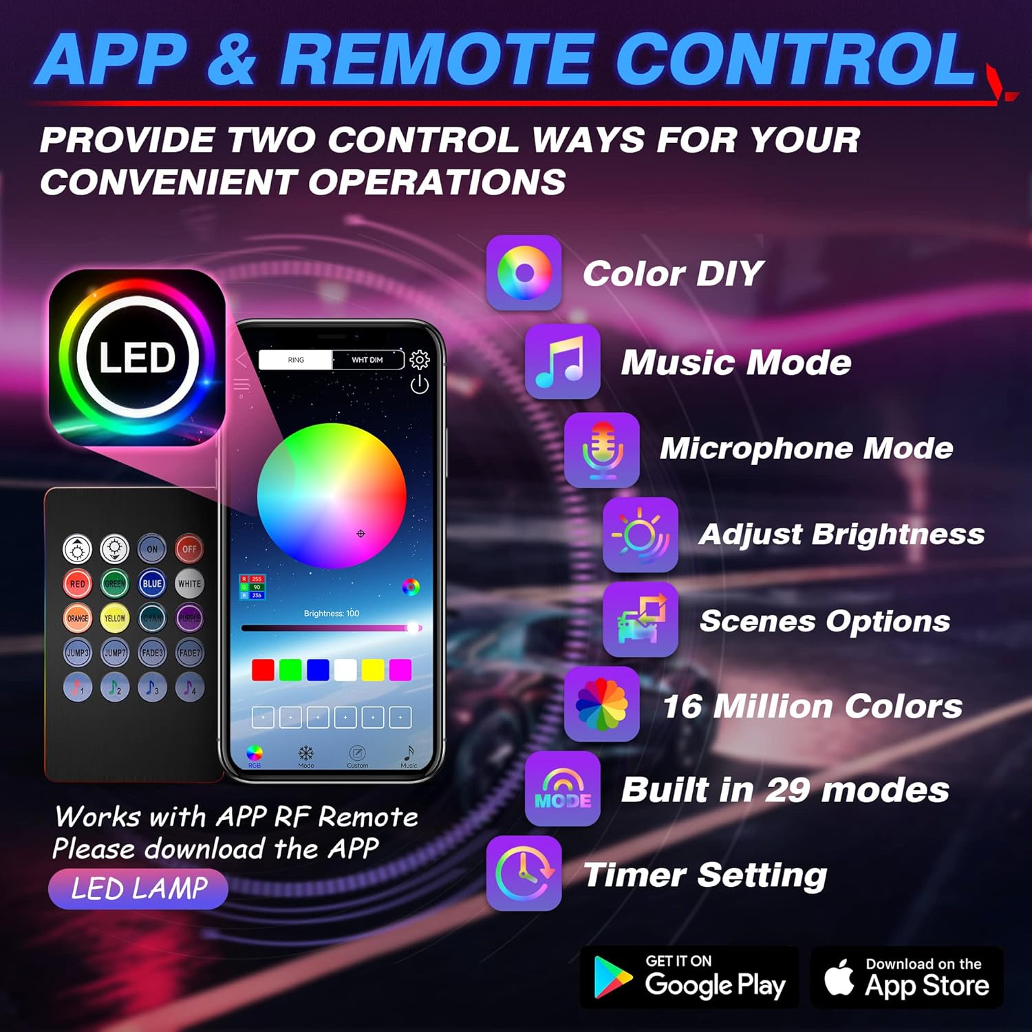 ★【Smart APP & Remote Control】You can easily control one or multiple sets of car led lights by APP ”LED LAMP” or remote. Turn lights on or off, dim or brighten, change colors, modes, DIY, timing and even adjust the speed of mode. Enjoy a comfortable and vibrant driving experience with convenient control