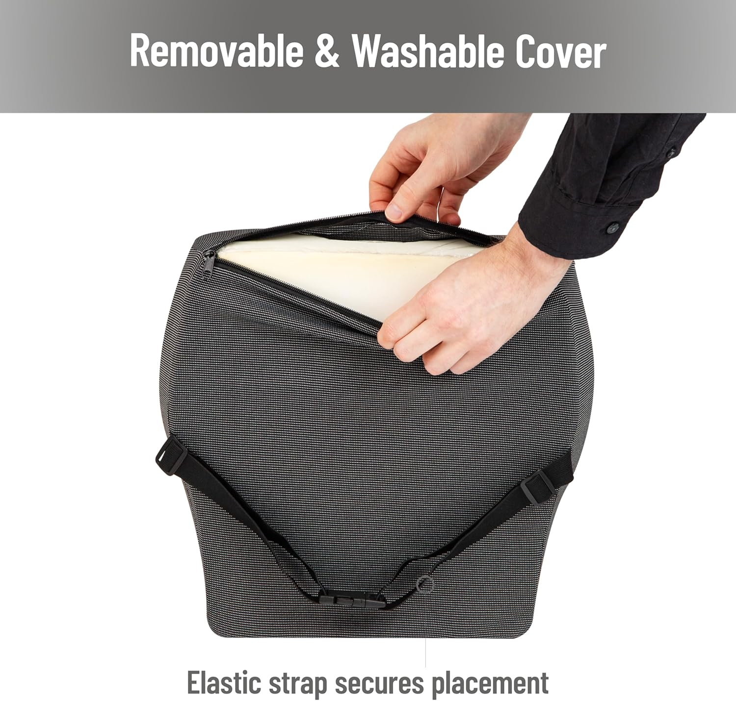 The built-in cooling gel layer helps dissipate heat, making it ideal for long periods of sitting. Lightweight and portable, this cushion is great for travel and fits most seats thanks to its adjustable elastic strap. A removable mesh cover offers breathability and easy cleaning, while the durable memory foam maintains its shape use after use.