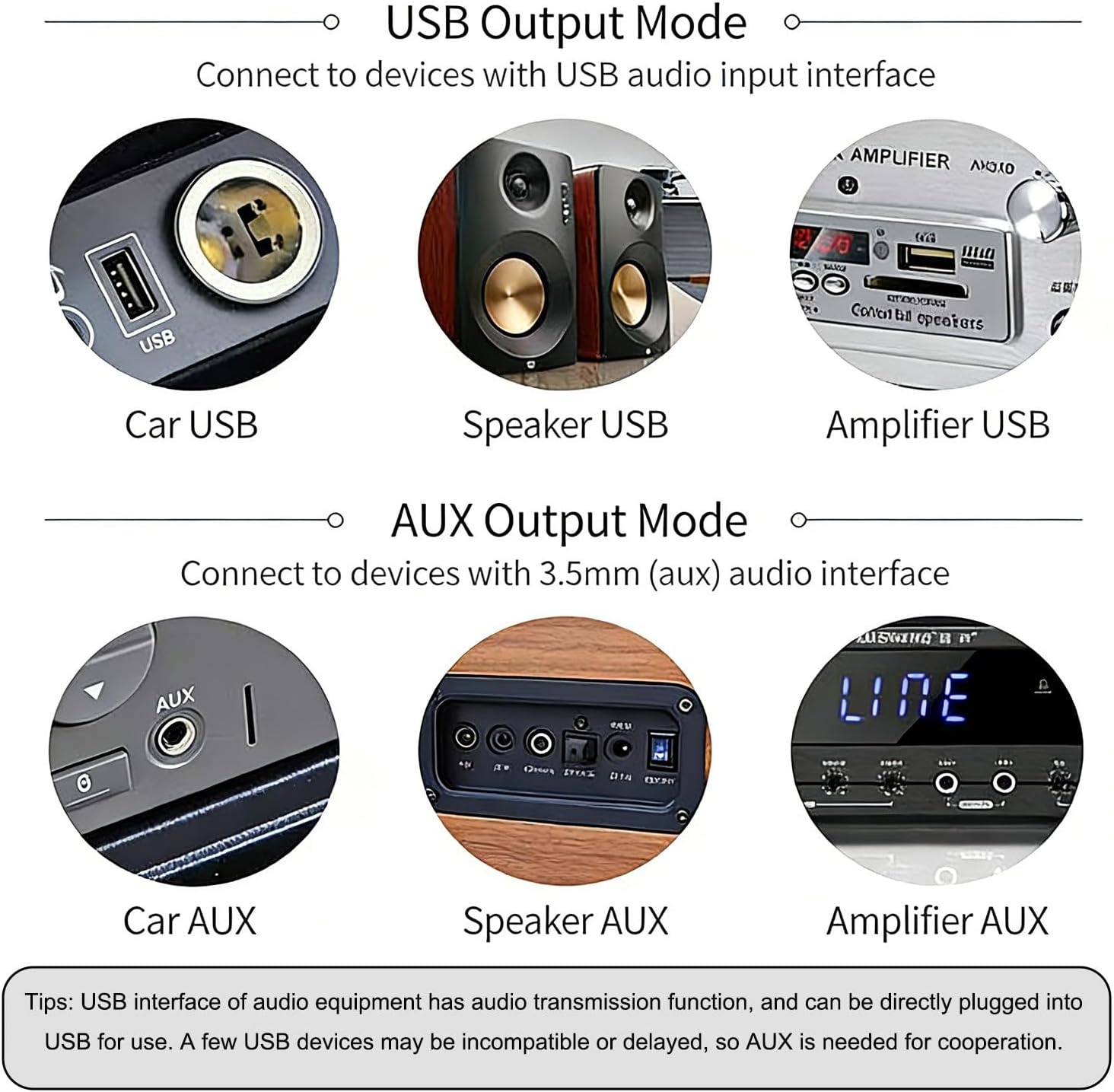 【Dual-port audio output】 Equipped with USB port and 3.5mm AUX audio interface, it can flexibly connect various audio devices such as non-Bluetooth car audio, home audio, speakers and wired headphones