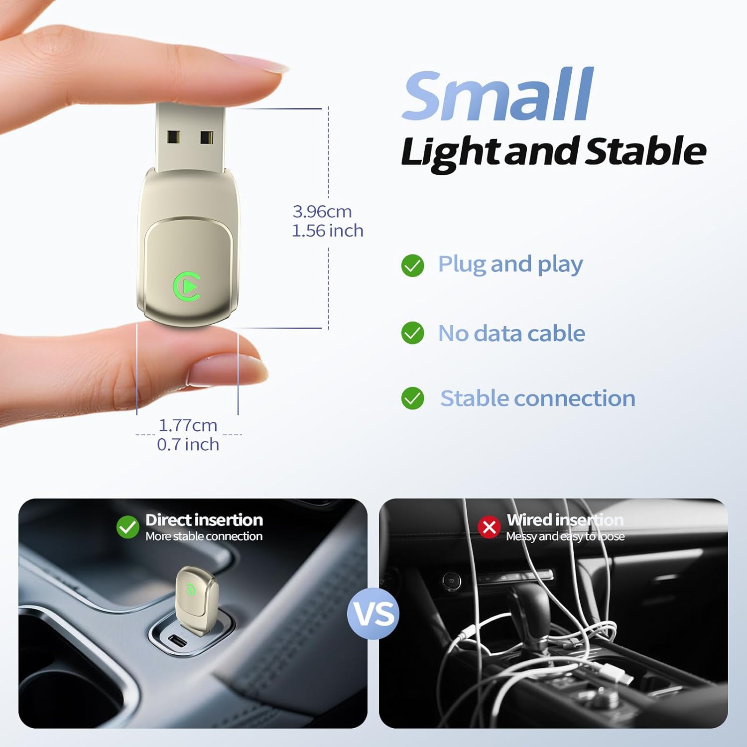 Compact and Thoughtful Design: Crafted from a blend of aluminum alloy and ABS, this Car Play Wireless Adapter combines a lightweight form with a refined finish. Its compact profile fits easily into narrow dashboard spaces without adding clutter. The material choice supports heat dissipation during use, while the stable connection helps reduce shaking or looseness over time. A clean, low-profile look allows it to blend seamlessly into your vehicle’s interior.