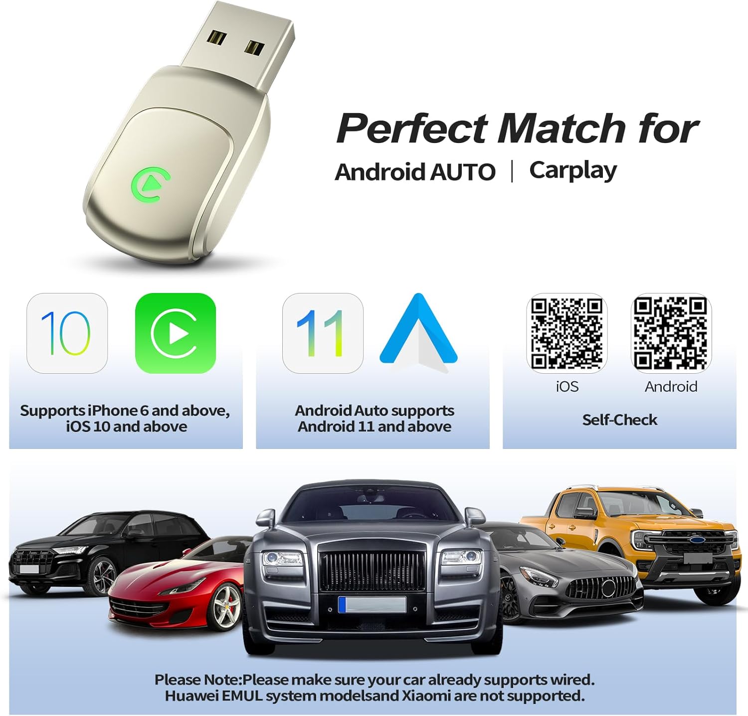 Wide Compatibility & Flexible Use: This wireless adapter is compatible with vehicles (2016 and newer) that come with factory-installed wired CarPlay or Android Auto. Works with iPhones running iOS 10+ and Android phones on Android 11 or later. Supports both USB-A and Type-C ports. Please confirm that your vehicle has wired CarPlay or Android Auto before purchasing.