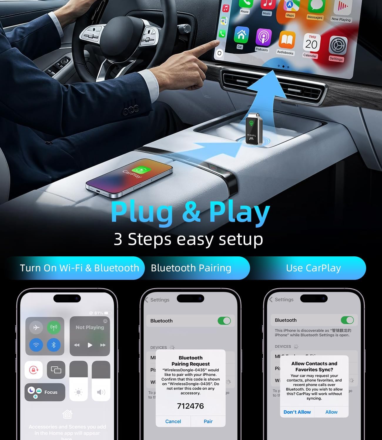 【Plug and Play with Lightning Fast Smart Connectivity】The android auto wireless adapter just needs 3 easy steps to activate Android Auto or CarPlay instantly – no additional apps or drivers required. Achieve first-time setup in 10 seconds and instant 3-second auto-reconnect daily, ensuring zero lag during navigation, music streaming, or hands-free calls. Enjoy a smooth, silent, and zero-latency connection that enhances your driving experience while keeping your focus on the road.