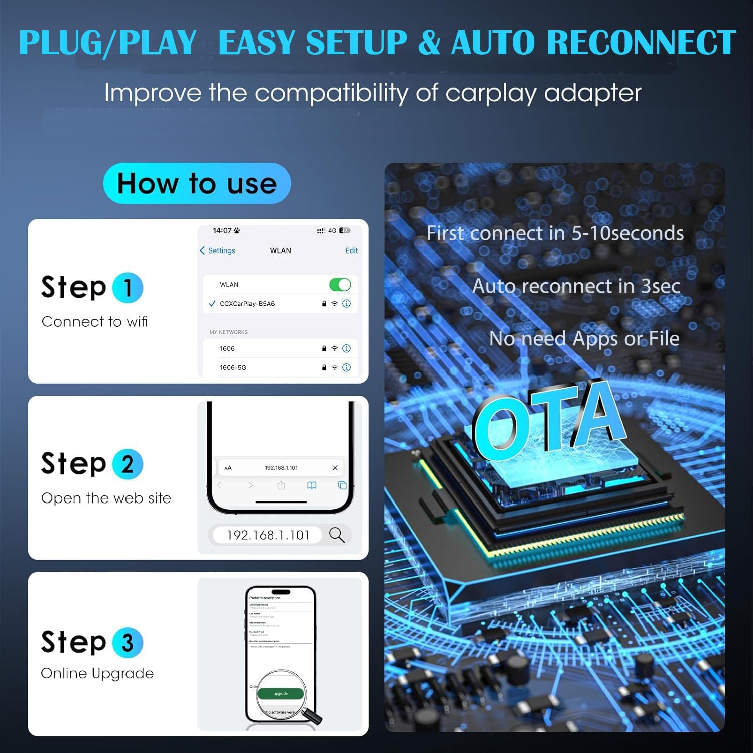 PLUG/PLAY EASY SETUP & AUTO-RECONNECT: No need apps or software electronics,Complete the first connect in 10seconds and auto reconnect in 3seconds (Bluetooth + Wifi). Experience transmission speeds 5times faster than other adapters.This stable car play eliminates the frustration of connection drops and ensures quick response times and zero delays low Latency.