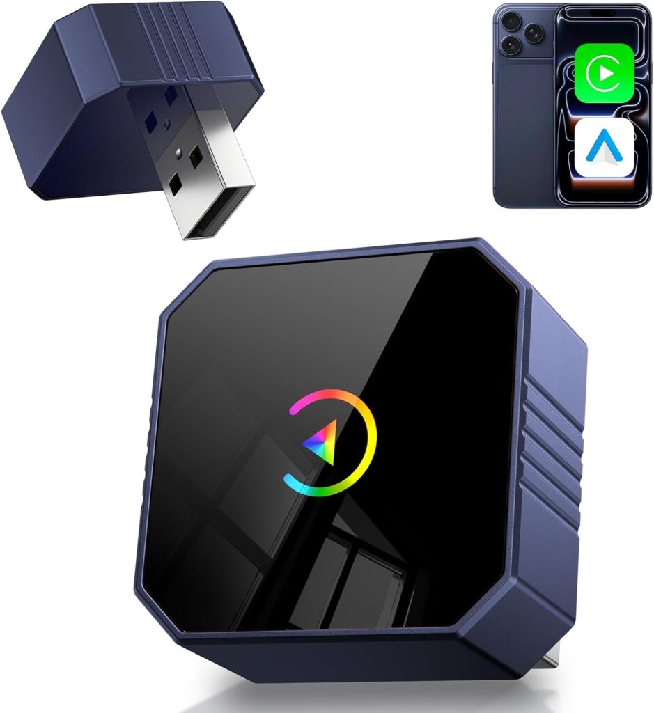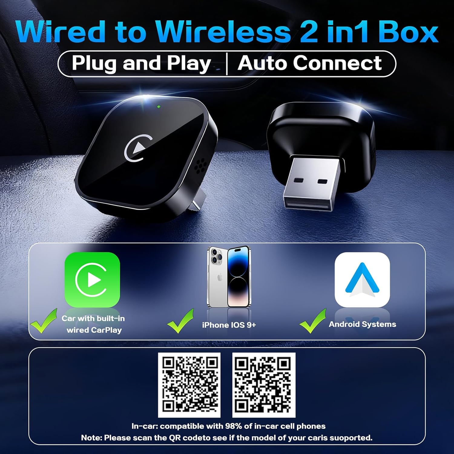 【2 in 1Carplay Wireless Adapter】: Wireless Carplay and Wireless Android Auto for iPhones and Android phones, Wireless carplay adapter for iPhones (iOS 9+) is compatible with 98% of vehicles after 2016 with OEM wired CarPlay. Includes both USB-A and USB-C adapters for all cars. Automatically adapts to vehicle screens and support split screen display.