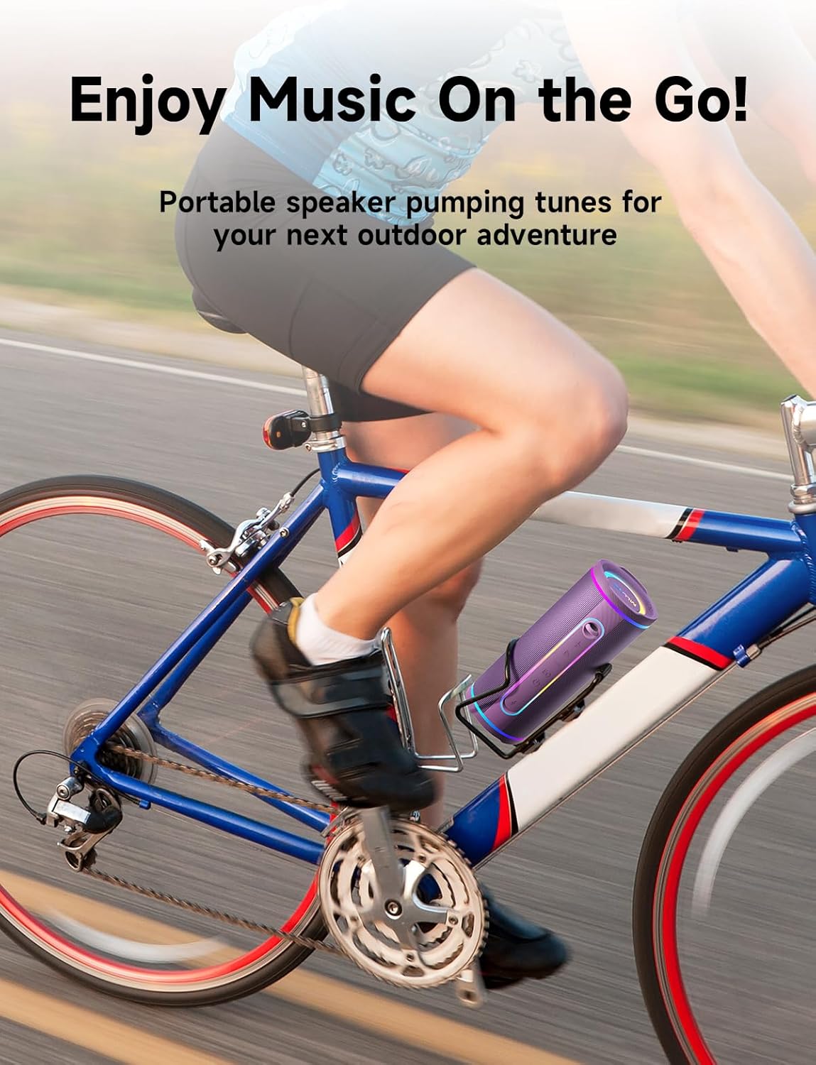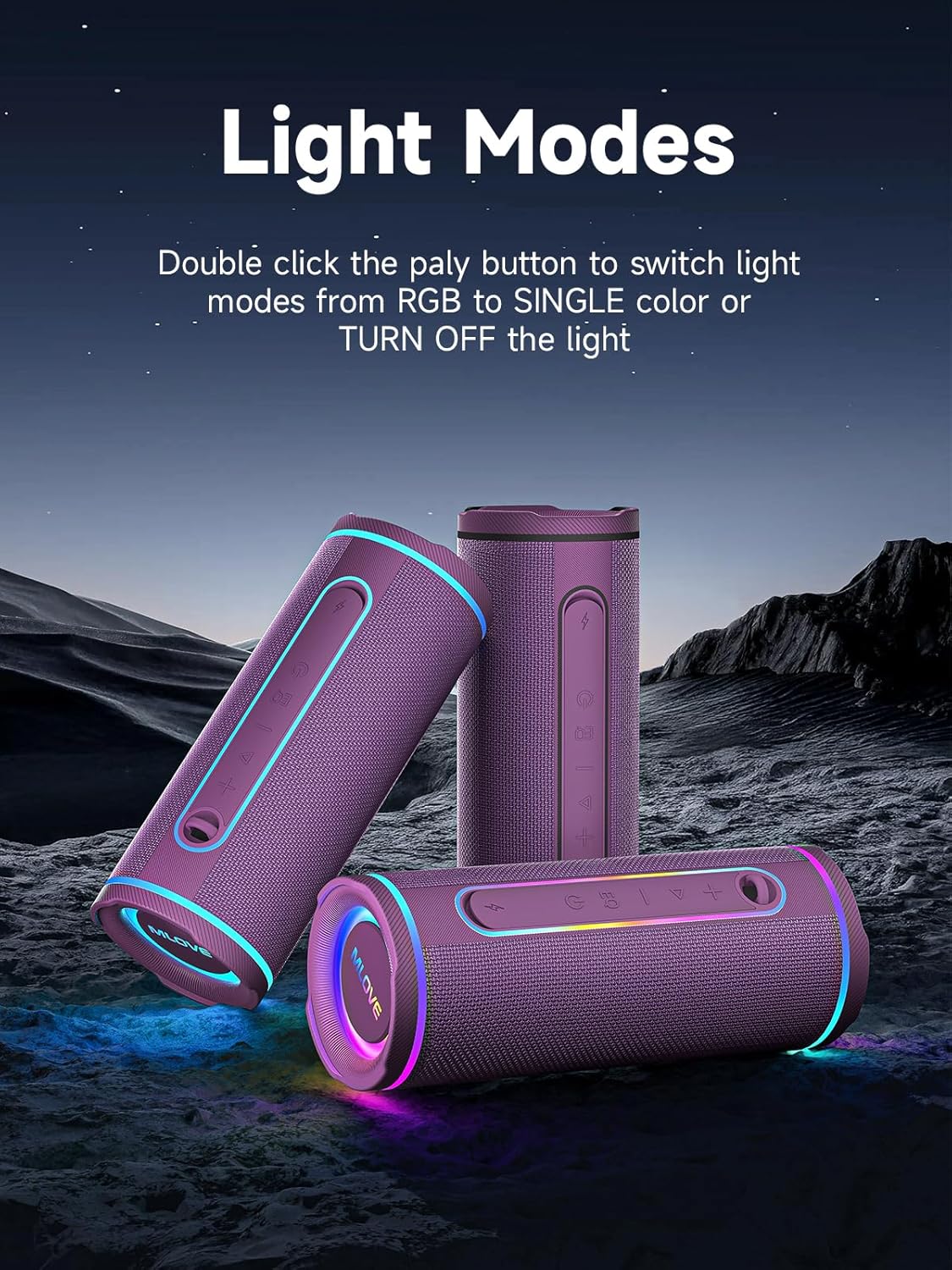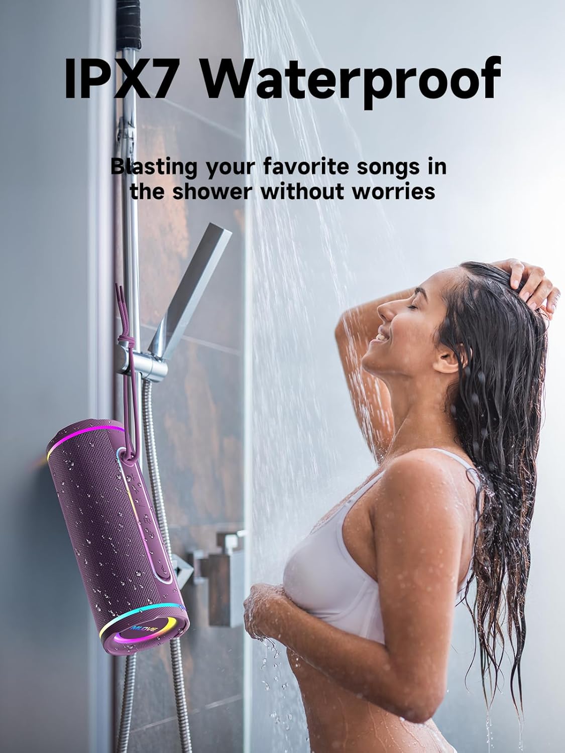 AMBIENT LIGHTS – 3 modes color changing lights in the led light up bluetooth speaker, dynamic led lights transform any space into a captivating light show – creating an immersive atmosphere perfect for parties, relaxing baths, workouts. Double click the play button of the wireless speakers with bluetooth to switch lights from RGB flowing mode to single color rhythm mode or turn off the lights
