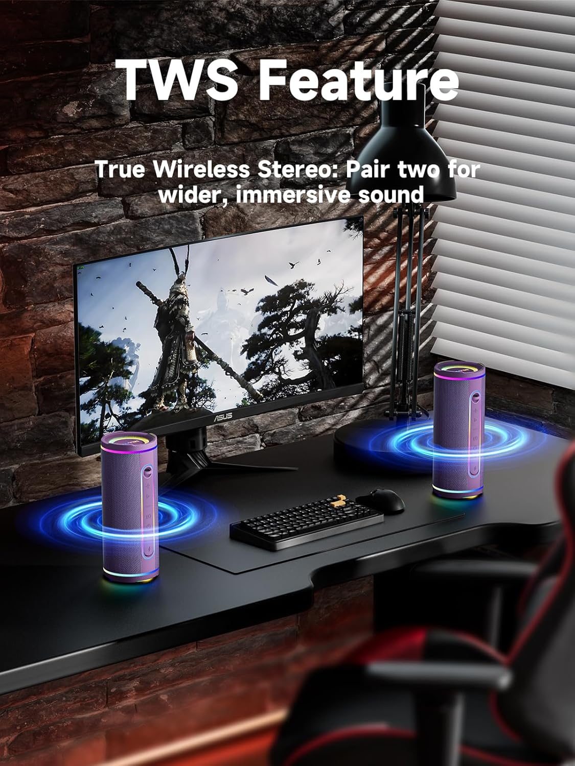 TWS DUAL PAIRING TIPS – For the first time of TWS connection, turn on two portable bluetooth speakers, MAKE SURE NO DEVICE has been connected with either of the two speakers. Click “+”&”-” of ONE speaker at the same time, beep sound will be heard, two speakers connected. Click “+”&”-” again to disconnected. Once connected successfully, you can control two speakers simultaneously, such as volume up & down, next / previous songs, pause / play, lighting change, EQ modes