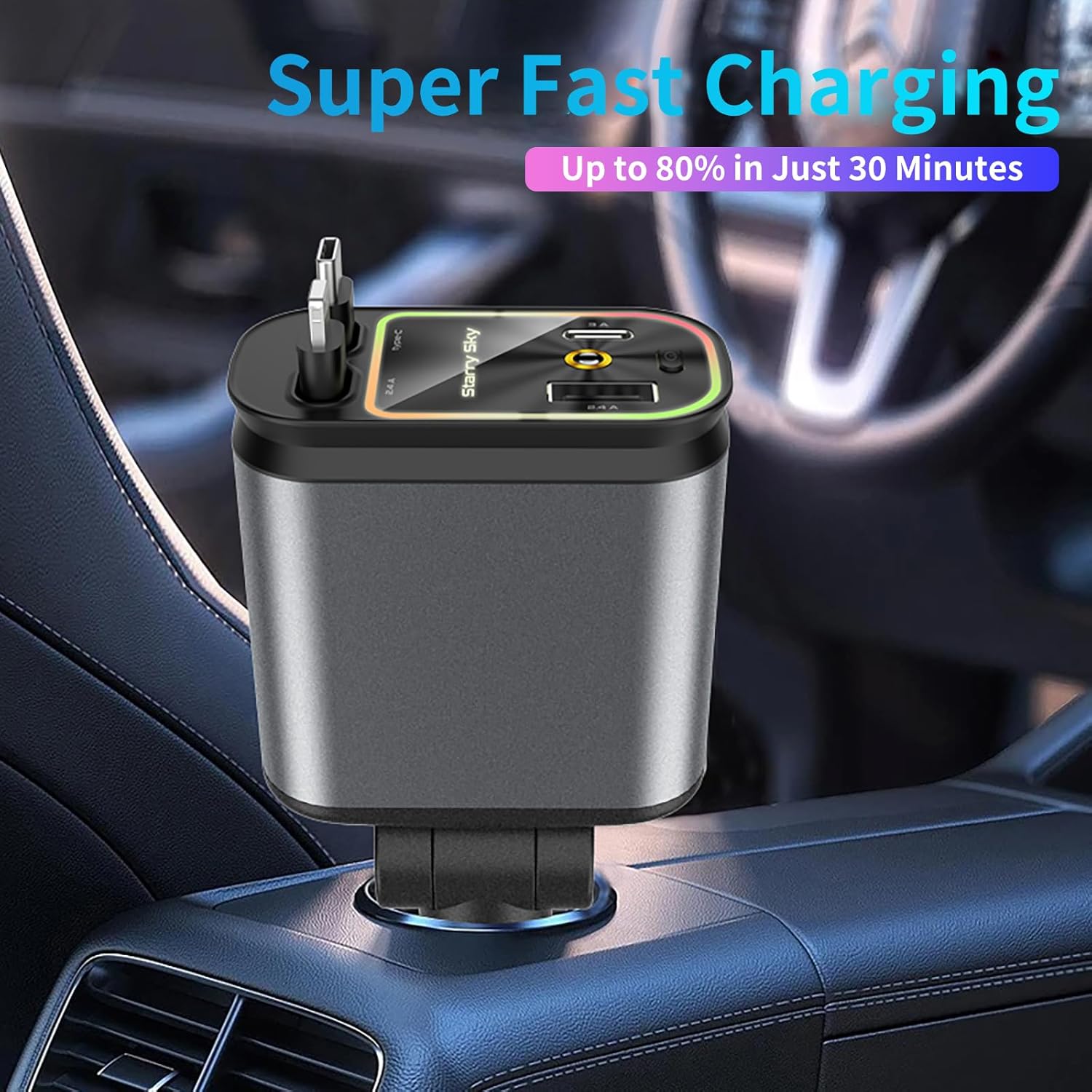 【4-in-1 Charging with Built-In Retractable Cables】:Charge up to four devices at once with two built-in retractable cables (USB-C & Lightning) plus USB-C and USB-A ports. The auto-retract design keeps your car clean, organized, and free from tangled cables.