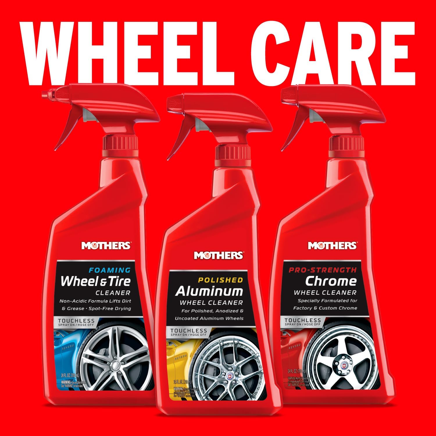 Mothers Foaming Wheel & Tire Cleaner is a foaming, non-acidic spray, formulated to quickly and easily clean both wheels and tires, including blackwalls and whitewalls. Safe for original equipment wheels and hubcaps, including clearcoated, painted, chrome and PVD. Its spray-on, hose-off design safely penetrates, dissolves and suspends all types of brake dust, grease, dirt and grime — making rinsing a snap. Its unique spot-free rinse leaves wheels perfectly clean, with no need to hand dry.
