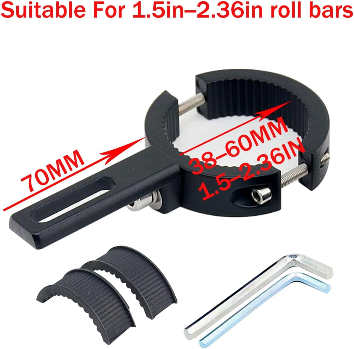 The light bar clamp can be adjusted to fit tubular bar bull bar roll cage crash bar bumper from 38mm(1.5″) to 60mm(2.36″) in diameter,