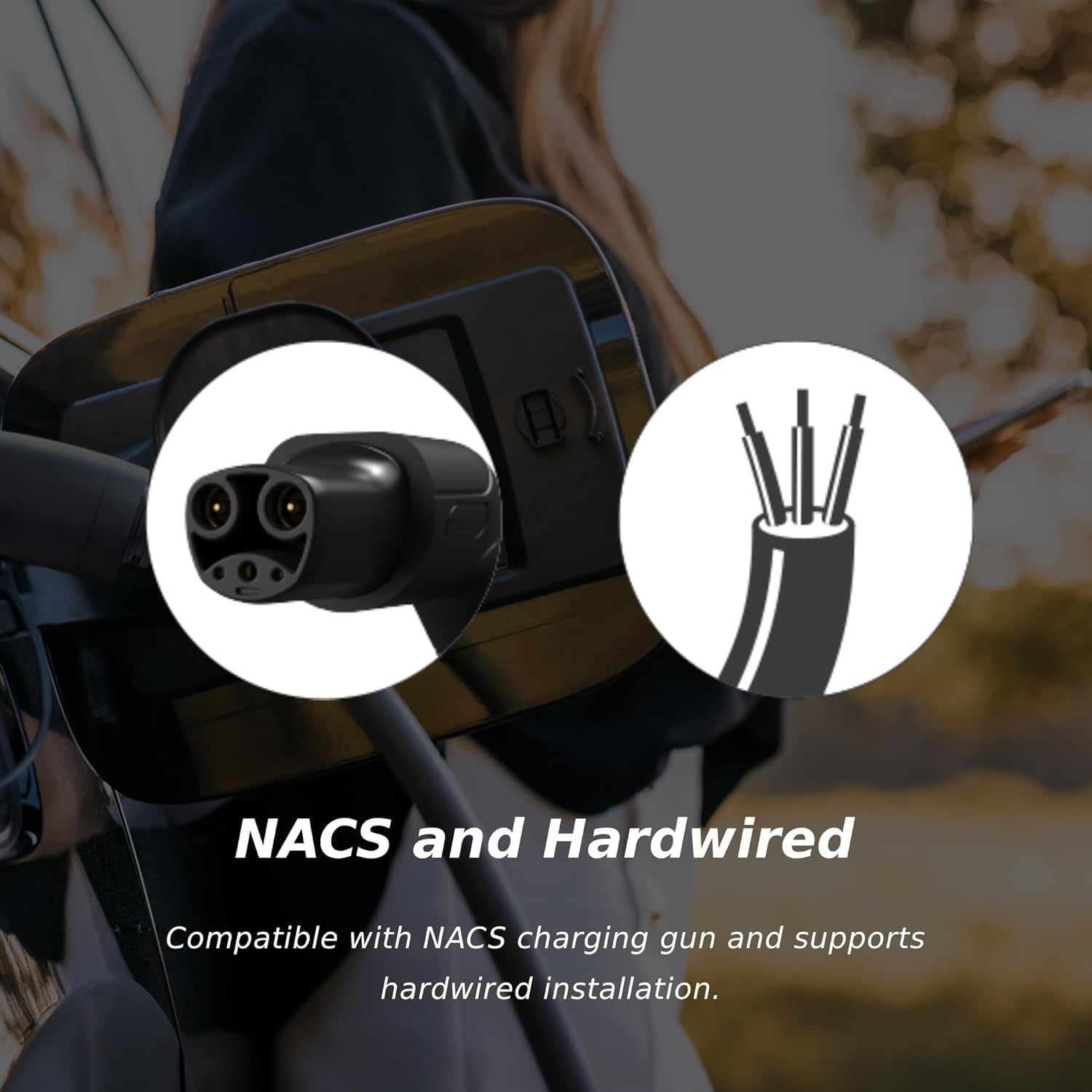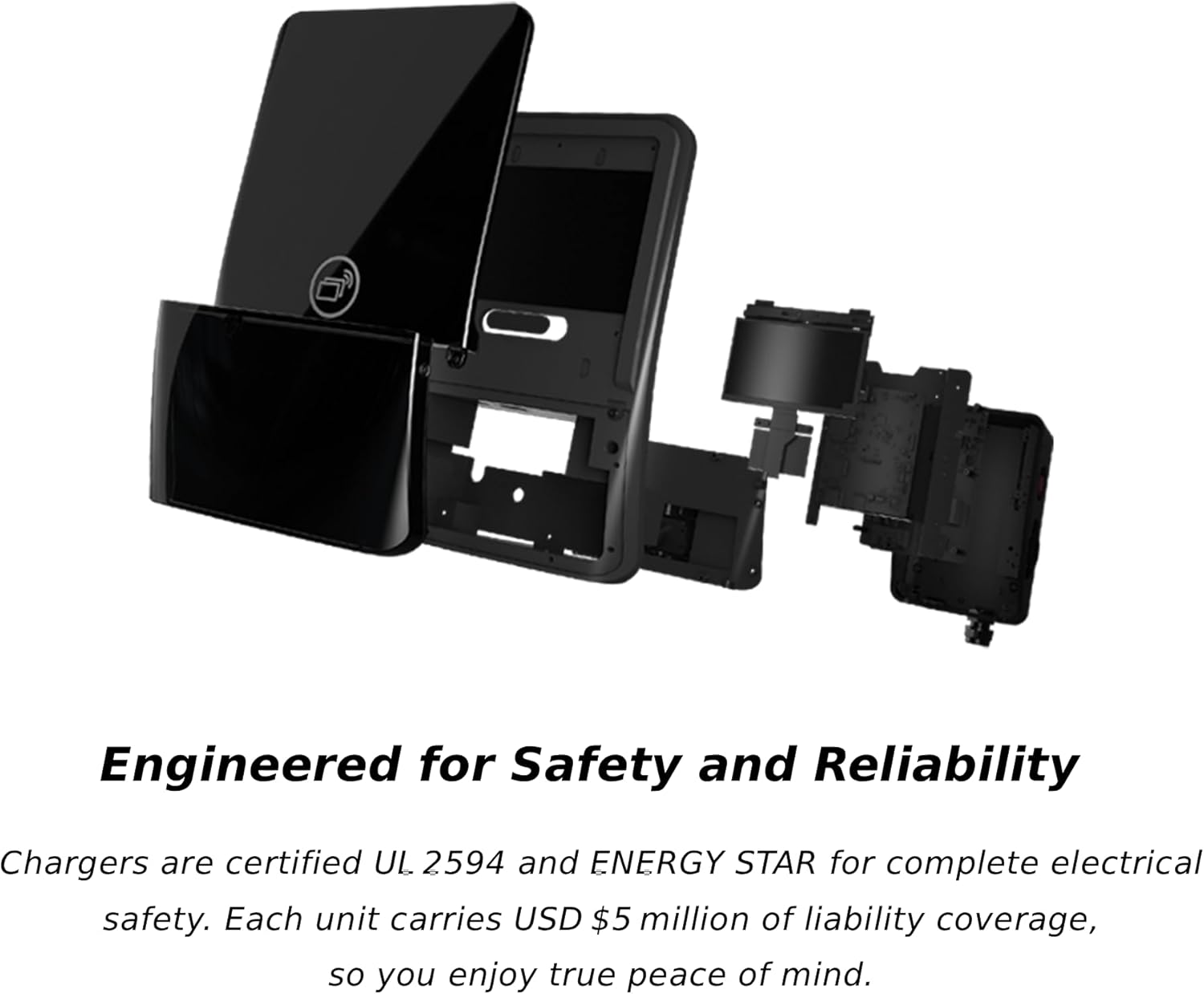 • 14.4kW / 60A, adds 43-59 miles of range per hour. • Equipped with NACS connector, compatible with Tesla. • Easy installation with NEMA 14-50 plug • 24.6 ft charging cable—easy to charge no matter how you park. • Easy operation via mobile app or RFID card. • Smart features include scheduling and adjustable current settings. • Supports LAN/Wi-Fi connectivity and remote monitoring. • IP55-rated for water and dust resistance, suitable for both indoor and outdoor use. • Supports mainstream OCPP 1.6J communication protocol, enabling seamless community system integration (requires EMS system). • Includes high-value product liability insurance (US$5M). • Industry-first certification for operation at altitudes up to 9,482 ft. • 5-year product warranty with comprehensive global customer support. • Compliant with UL and Energy Star certification.