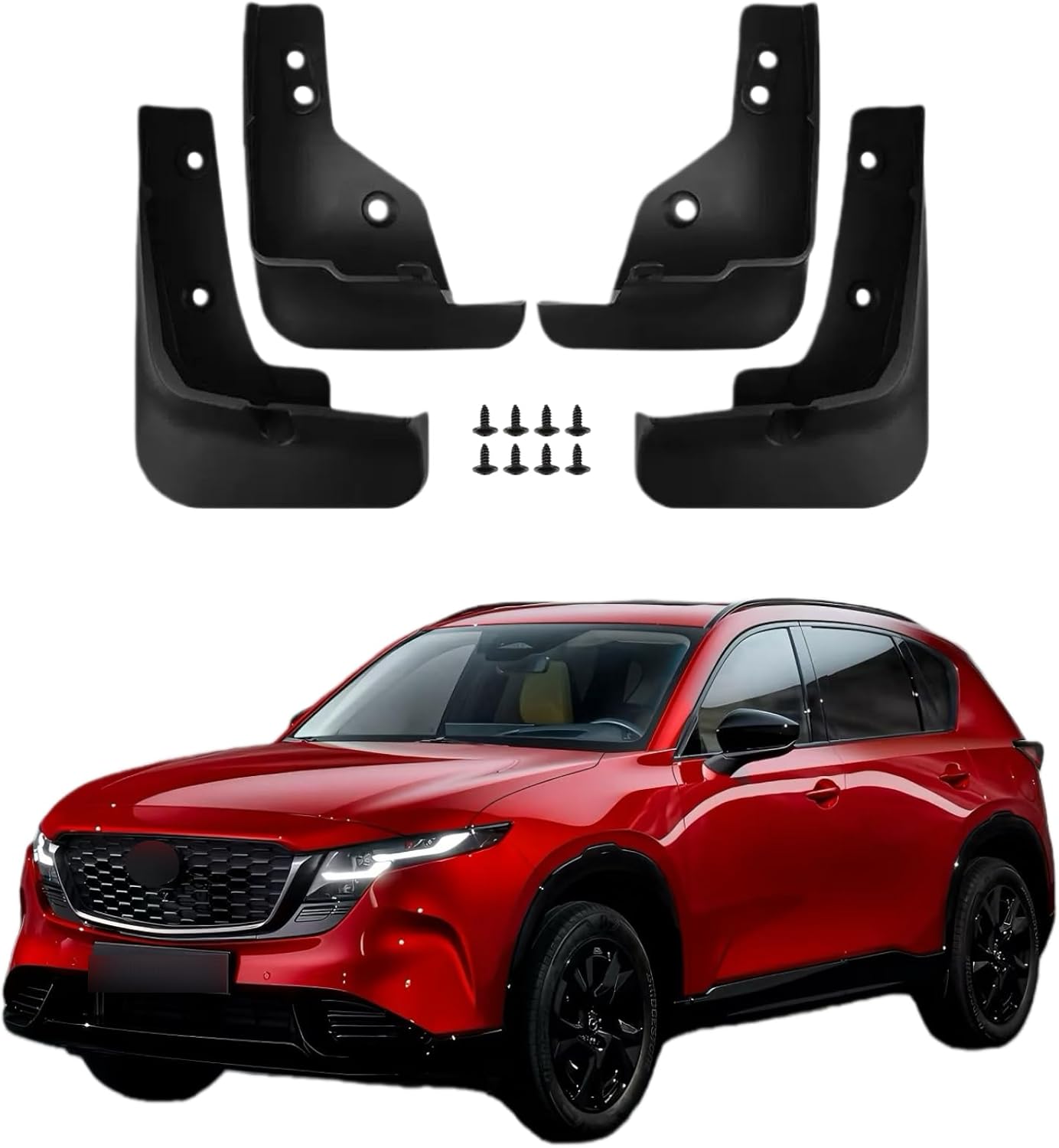 I ordered these mud flaps for our 2024 Mazda CX-5. The instructions were not helpful. At all. The flaps aren’t labeled. Even just an F or B would’ve been something useful.Our Mazda doesn’t have screws. It has retainer clips and plugs. The rear tires each had a screw and washer underneath. The screws provided by the manufacturer? Couldn’t use them. Too narrow and just reused the original plugs. In fact, I had to find different screws/washers to secure the bottoms of the rear mud flaps because the OEMs were too short due of the addition of the mud flaps. And, of course, the ones provided by the manufacturer were too narrow AND too short. The front mud flaps also have a place to secure them at the bottom. I don’t know if it was intentional or a Mazda manufacturing oversight, but the holes on both sides were empty. I’m guessing it should have had retainer clips and plugs because the hole was too big for the bolts I used in the rear. As a result, had to find something else to secure that part. Fun times.This “simple” installation took way longer than it should have simply because of the terrible instructions and the useless screws. But, I figured it out and got it done. Does it look as great as I hoped they would? Meh. Somehow they came across as beefier in the seller’s photos. Maybe it’s our car color, maybe it’s photoshop. But they just look smaller.The quality of the mud flaps themselves seem good. They are not twisty and bendy. They are a hard plastic–unless the seller has changed them in the last couple of months.