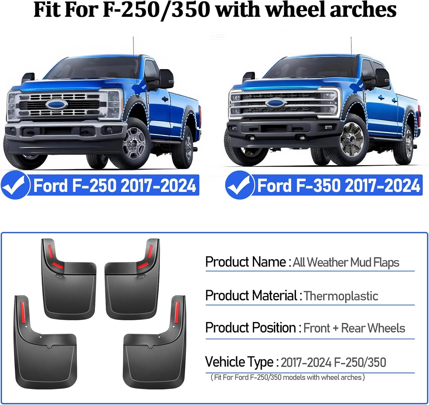 【Custom-Designed for Ford F250/F350】These Ford F250 mud flaps and Ford F350 mud flaps are precision-engineered for 2017-2024 F250/F350 models with fender flares (not compatible with dually, F-450, or F-550), offering a perfect fit with original mounting holes for a seamless, no-drill mud flaps installation.
