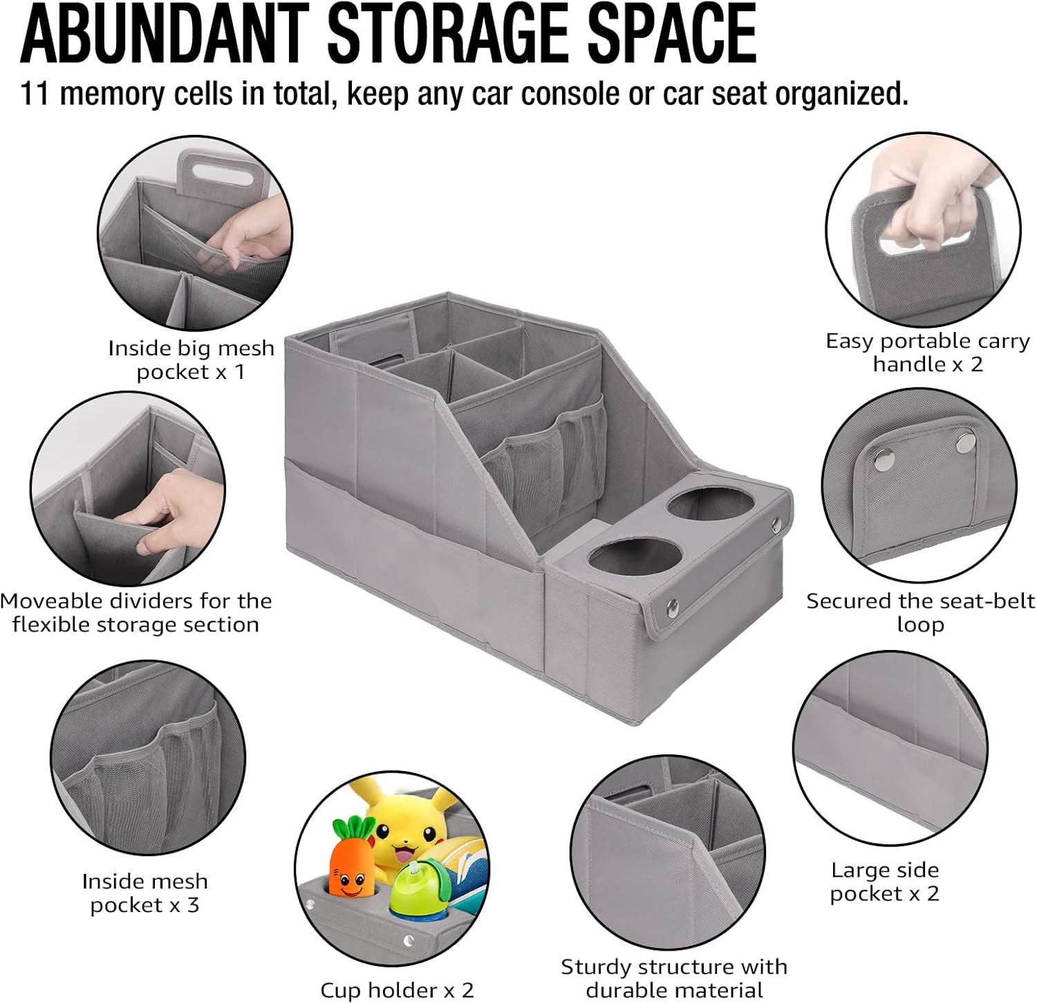 More Storage Space: The car storage organizer has 5 spacious main bag areas, 4 internal mesh pockets, 2 built-in cup holders(collapsible), and 2 oversized side pockets to keep any car console or car seat organized. can be used for organizing and storing snacks, books, games, toys, or anything they may need for a long road trip.