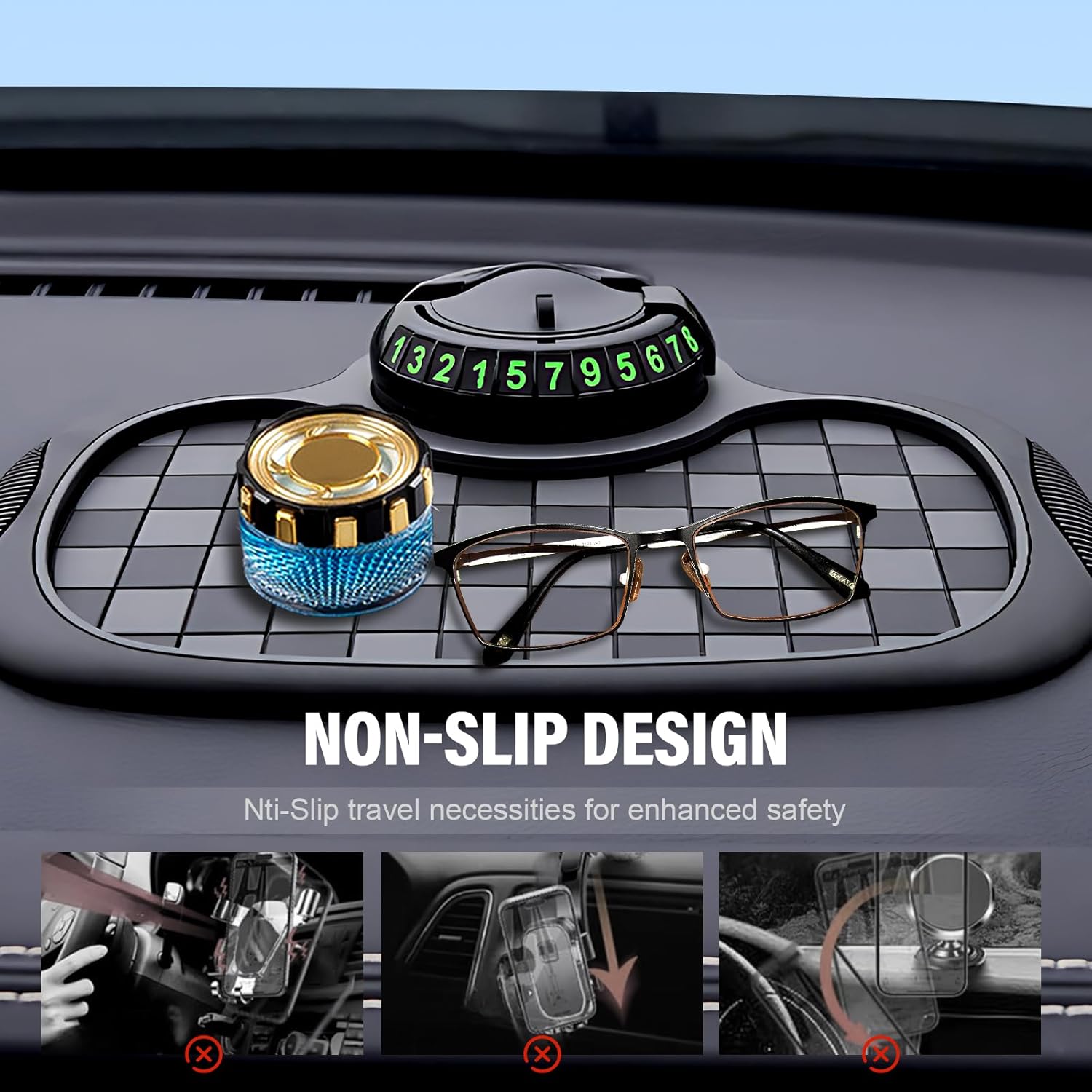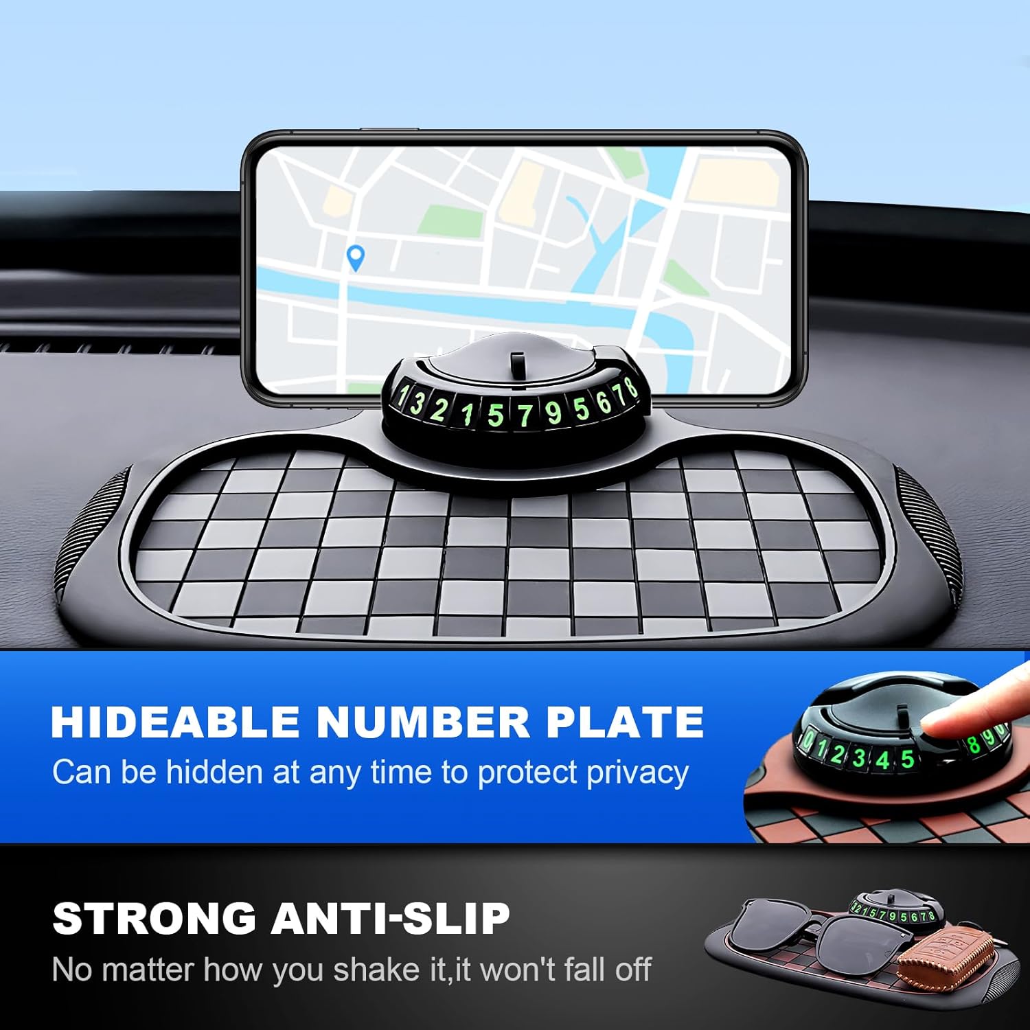 【Car Anti Slip Mat Dashboard】Never worry about parking again! Our Car Anti-Slip Mat with Temporary Parking Number comes with a reusable number card (0-9) to display your contact info when needed—and hide it when you’re away