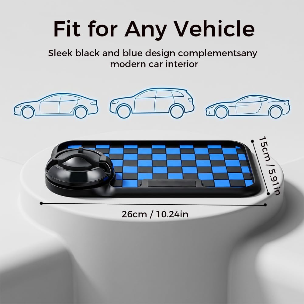 3-in-1 Multifunctional Dashboard Organizer: This multifunctional car anti-slip mat combines a non-slip dashboard pad, a 360° rotating phone holder, and a hidden parking number plate into one convenient accessory. Keep your phone, keys, sunglasses, and small essentials organized while driving
