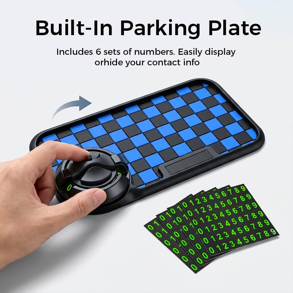 3-in-1 Multifunctional Dashboard Organizer: This multifunctional car anti-slip mat combines a non-slip dashboard pad, a 360° rotating phone holder, and a hidden parking number plate into one convenient accessory. Keep your phone, keys, sunglasses, and small essentials organized while driving
