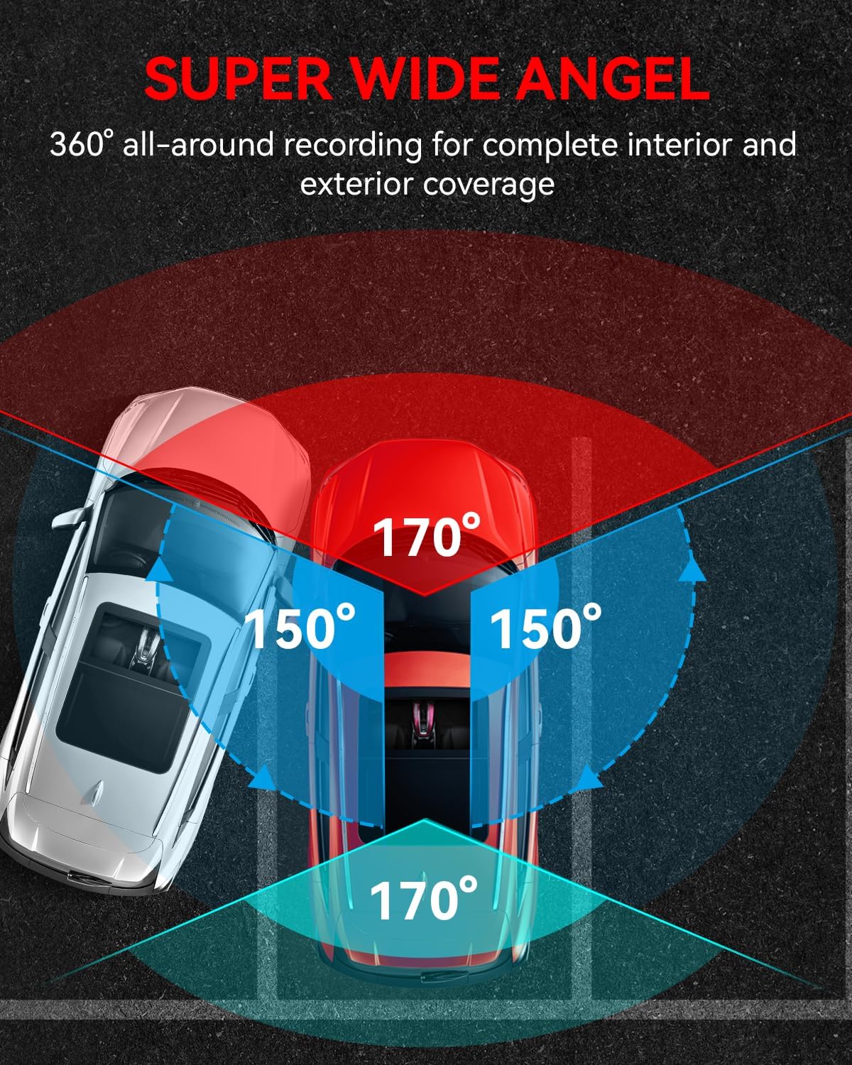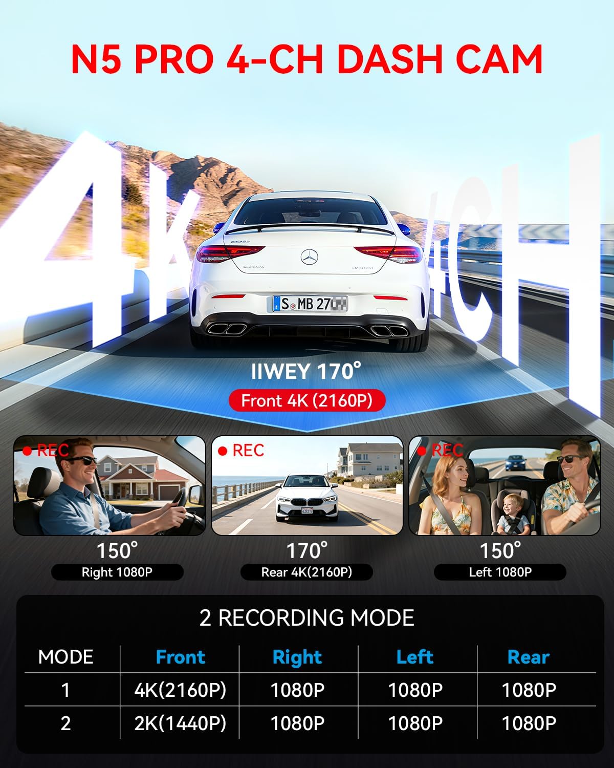 🔥4K Ultra HD + Full 360° Wide-Angle Coverage The N5 PRO captures crystal-clear 4K (2160P) front footage with 1080P on the other 3 channels, ensuring maximum detail from every angle. A 2K+1080P*3 recording option is also available for customers who prefer longer recording times. Equipped with 170° ultra-wide front & rear lenses and 150° wide-angle side cameras, the system provides true 360° panoramic coverage with greatly reduced blind spots.