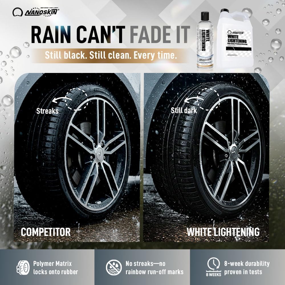 NANOSKIN WHITE LIGHTENING High Gloss Premium Dressing produces the highest shine possible on tires and exterior rubber and plastic trim. By using unique “Polymer Matrix” emulsifier, WHITE LIGHTENING is durable and reduces centrifugal sling-off on vertical surfaces, leaving no streaks or surface haze. WHITE LIGHTENING is a water-based formula that provides the same durability and “wet look” typically associated with solvent-based dressings.