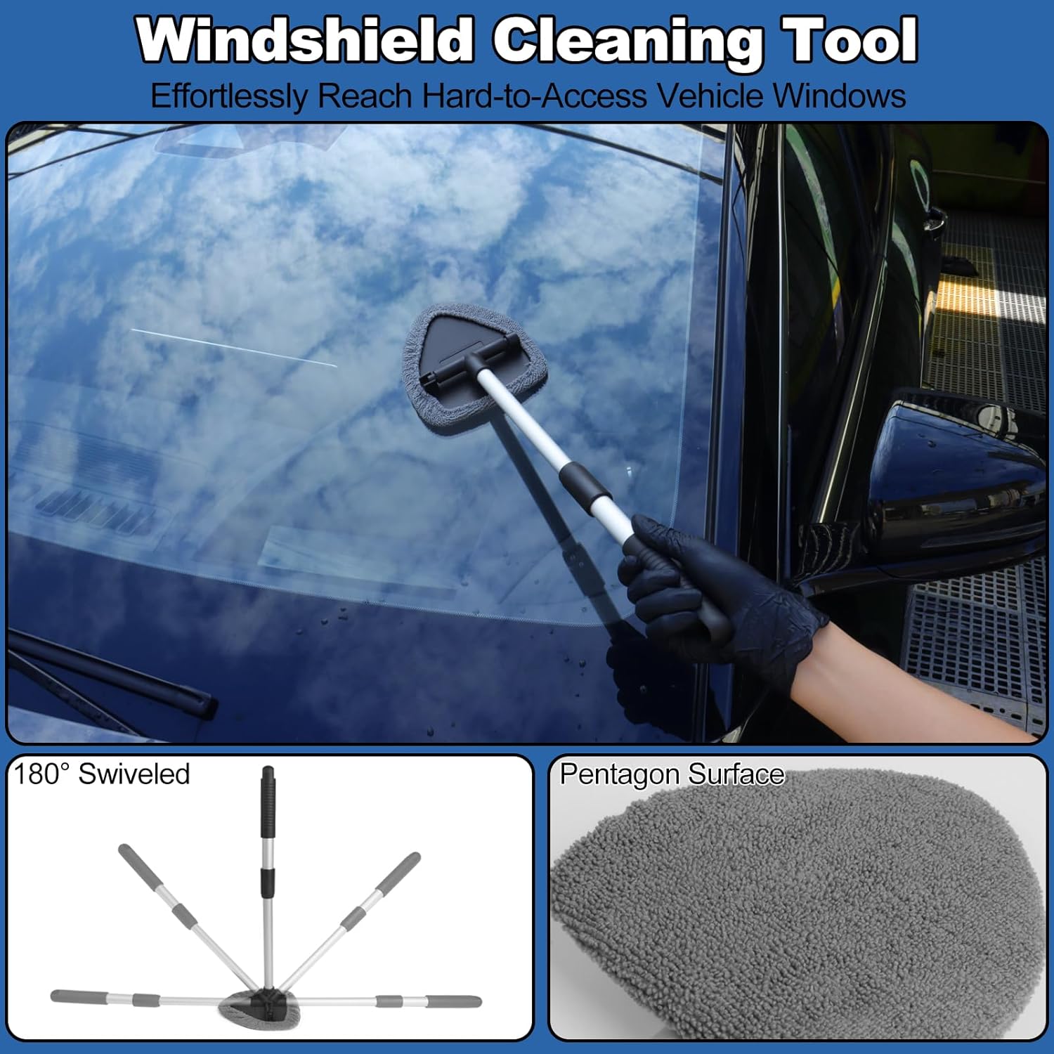 Premium Windshield Cleaner Tool for Hard-to-Reach Areas: The star windshield cleaner tool features an extendable handle and 180° swivel head, easily conforming to glass surfaces to remove dust, dirt, and oil film from inside windshields and car windows. Equipped with 2 reusable microfiber pads, it delivers streak-free results every time—perfect for maintaining clear visibility while driving.