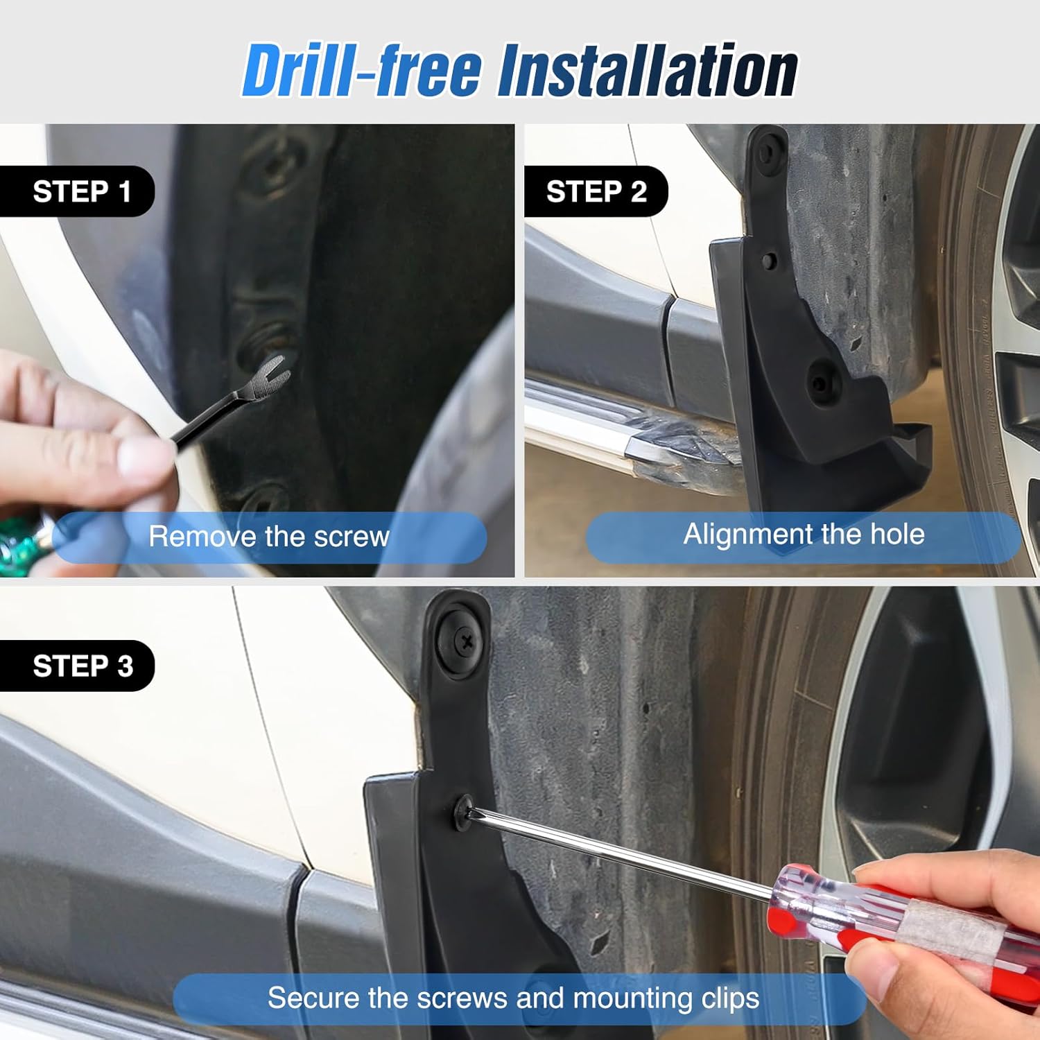 Easy Installation: Designed for quick setup, our mud flaps securely screw directly into your car’s original holes using provided hardware, ensuring firm installation in minutes