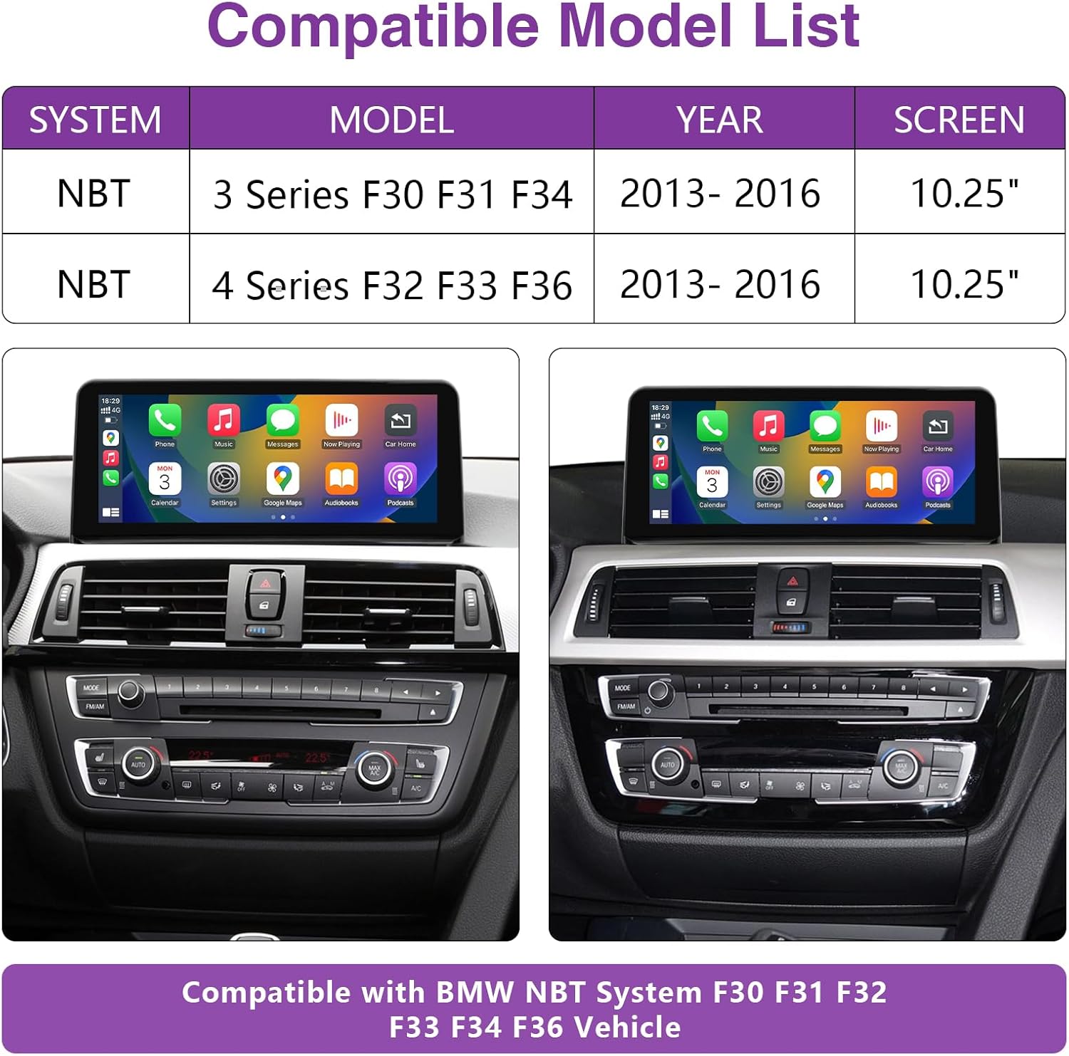 Compatible with the BMW 3/4 Series NBT System manufactured from 2013 to 2016. This encompasses various models, including F30/F31/F32/F33/F34/F36.Note: Please ensure that your car system is NBT. You can check our picture for reference. If you’re unsure, you can ask for assistance.