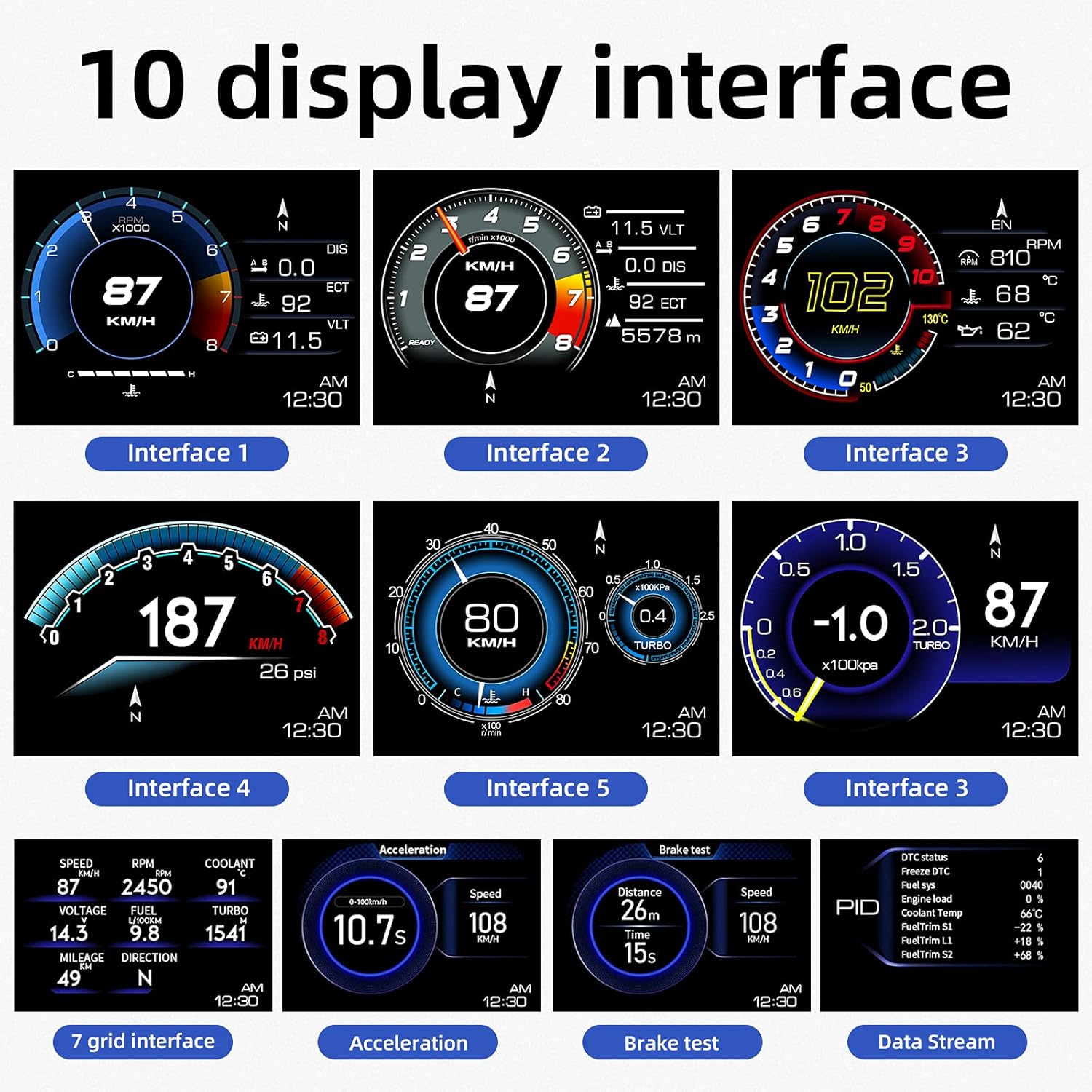 10 interchangeable interfaces, free switching; LCD display for clear fault codes and data stream reading; 2 installation methods with adjustable bracket (dashboard mount or windshield sticker), easy operation, non-destructive installation.