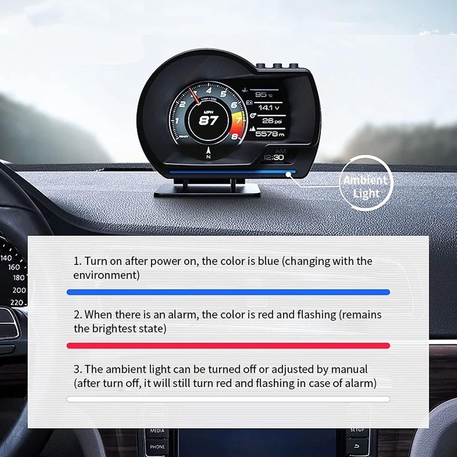 OBD2 GAUGE DISPLAY: Features 3in/7.6cm screen with OBD2 gauge display, works on 11-18V systems (24V+ requires USB power)