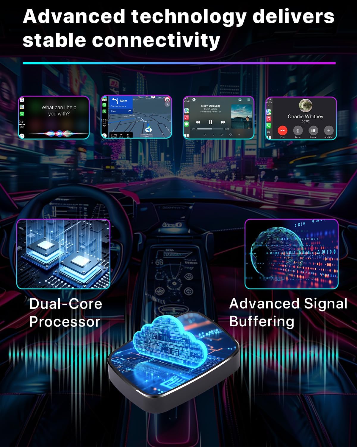 【Ultra-Stable Connection &Reliable Daily Driving】Built to stay stable through everyday driving conditions.. Equipped with a dual-core processor + advanced signal buffering, the adapter maintains stable data flow even during navigation switching, incoming calls, or app multitasking. Passed intensive vibration and road condition tests, ensuring continuous performance on rough roads. Precision deep-lock USB & Type-C connectors prevent power interruption, eliminating random disconnections during driving.