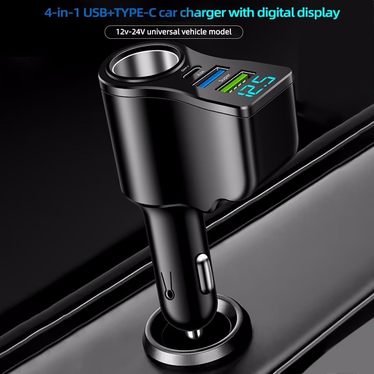 One to Four with USB+Type-c Multifunctional Car Charger with Digital Display Suitable, Black
