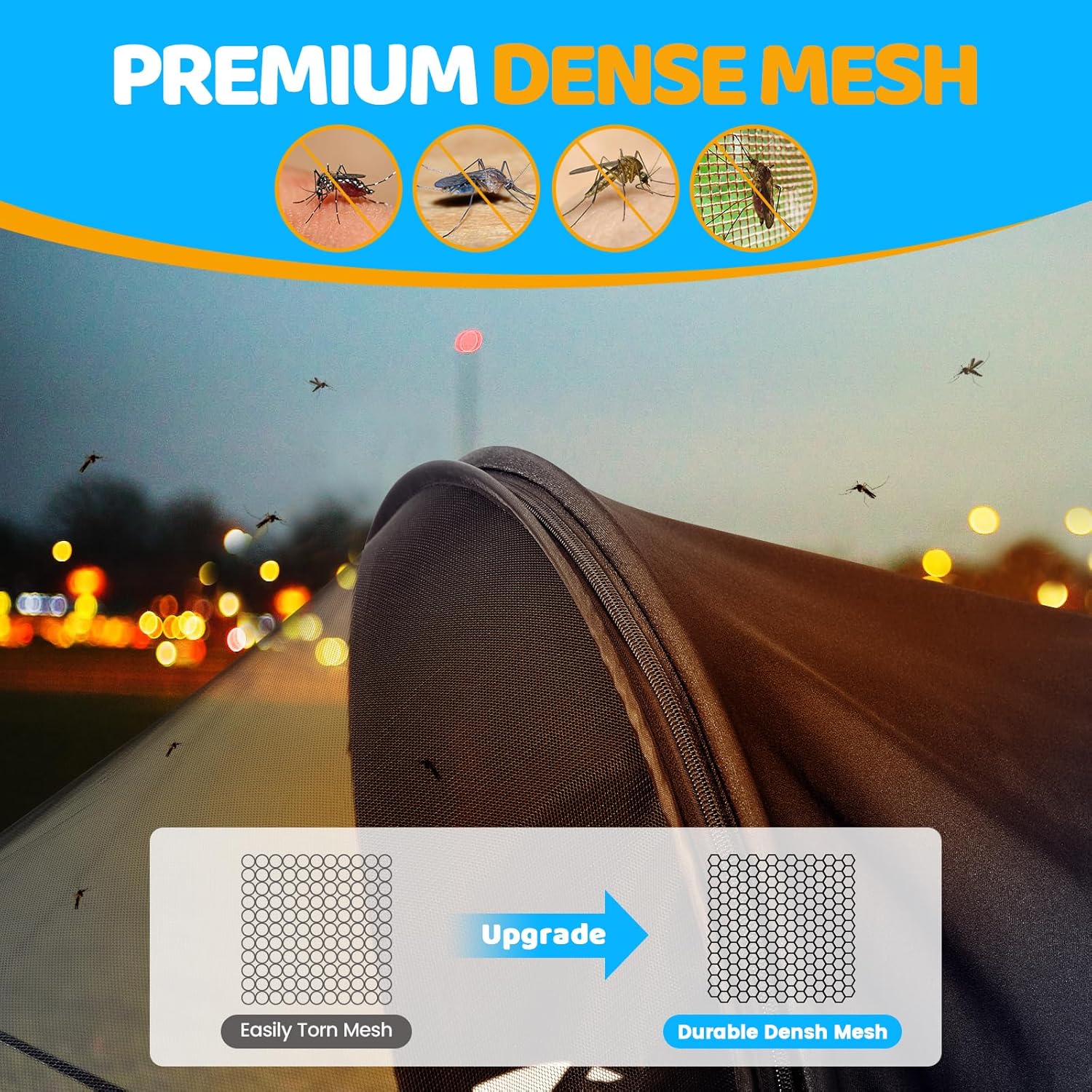 Tear-resistant Dense Mesh and PVC Support Strips can block insects and provide strong support to prevent it from being blown off. Zipper Design and Multi-fixations make it easy to access baby without removing the whole net and make it more stable with straps tied.