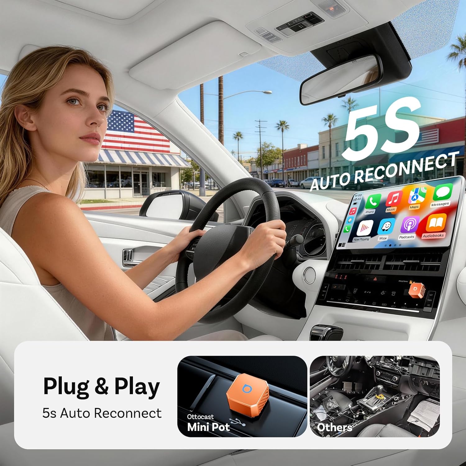 【Fast Auto Connection】:The OTTOCAST Mini Pot reconnect instantly once you start your engine. No need to plug in cables every time.( After a long day, just get in your car and your playlist and podcasts are ready before you even adjust your seat.)