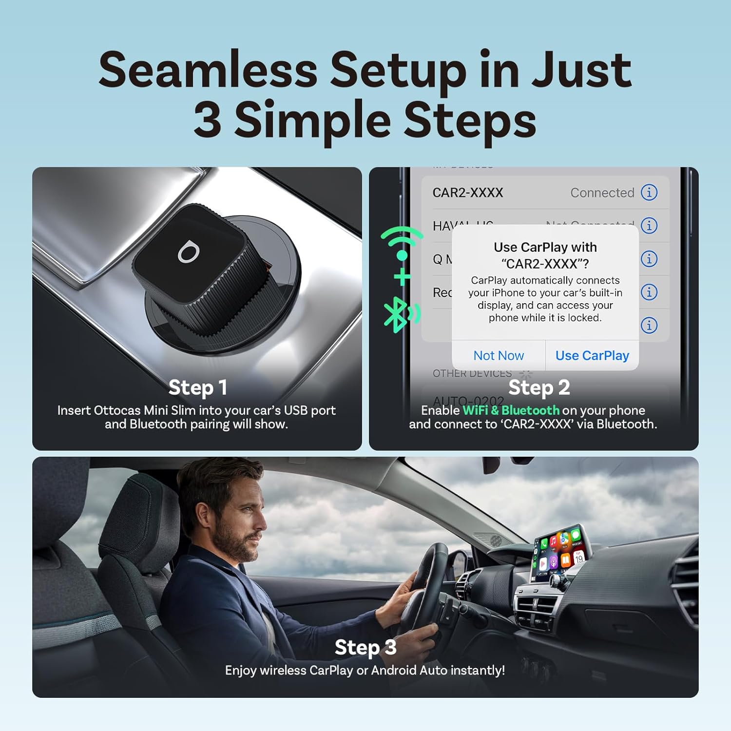 The Ottocast Mini Wireless 2-in-1 Adapter requires no professional installation. Just plug it into your car’s USB, enable Bluetooth and WiFi, pair with ‘CAR2-XXXX,’ and connect in 10 seconds. No apps or complex setup needed!