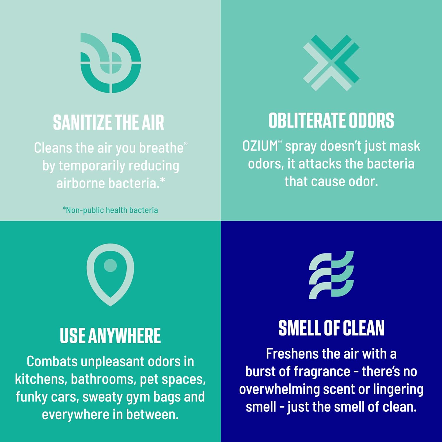 MORE THAN JUST AN AIR FRESHENER: OZIUM air sanitizing spray isn’t your typical home or car air freshener, it makes smells disappear by reducing odor-causing bacteria and germs.