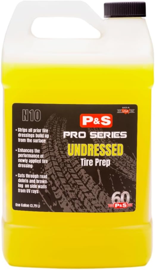 P & S Professional Detail Products Undressed Tire Prep – 1 Gallon – Alkaline Water-Based Tire Cleaner – Removes Dirt, Oil & Grime – Strips Old Dressings – Brightens Whitewalls