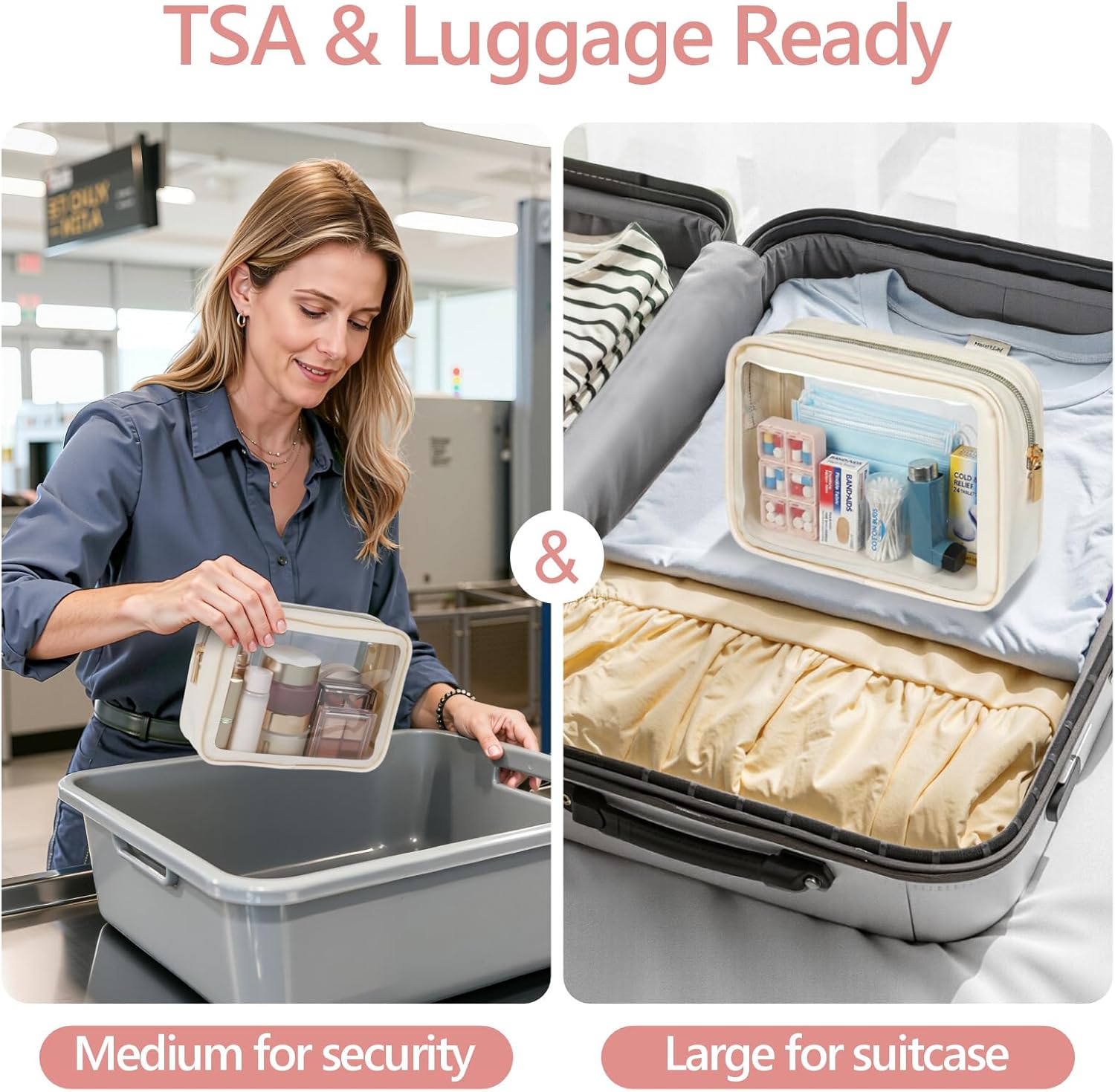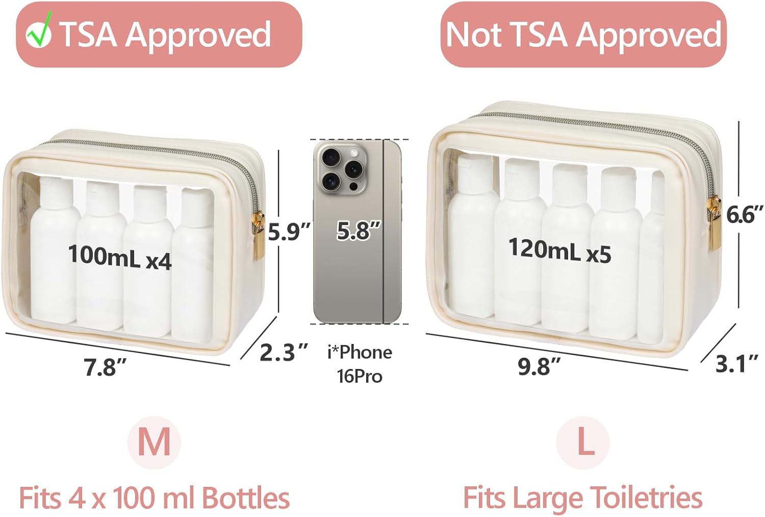 A: The Medium bag (7.5 x 2.2 x 5.5 inches) follows the TSA 3-1-1 liquids rule for carry-on luggage. The Large bag (9.7 x 3.2 x 6.5 inches) is designed for checked luggage or larger items that do not need to pass through the liquids screening.