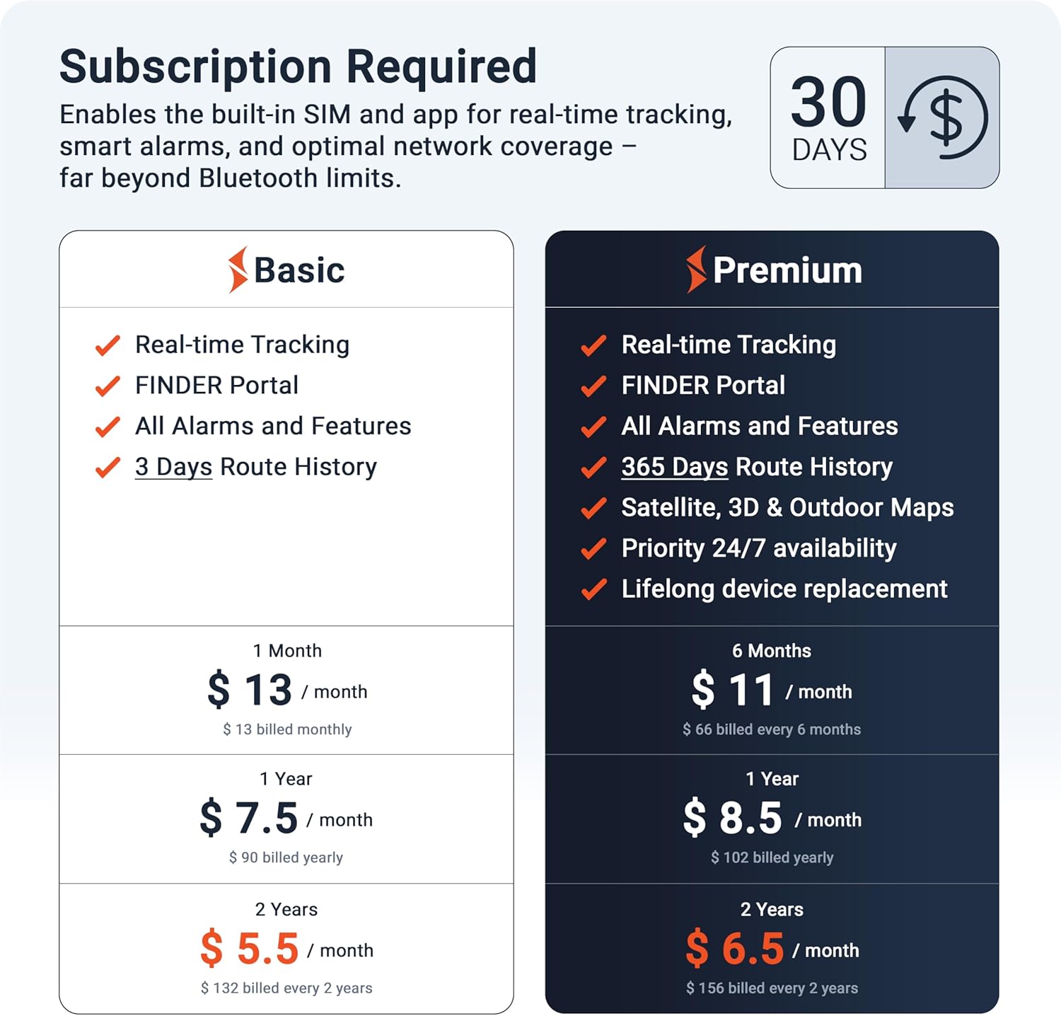 SUBSCRIPTION REQUIRED: The PAJ GPS Power Finder includes a SIM card and offers lifetime device replacement. Enjoy 24/7 multilingual customer support and easy control via our free app, compatible with Android and iOS. Choose from flexible Premium or Basic plans, starting at $5.50/month, with options up to 2 years.