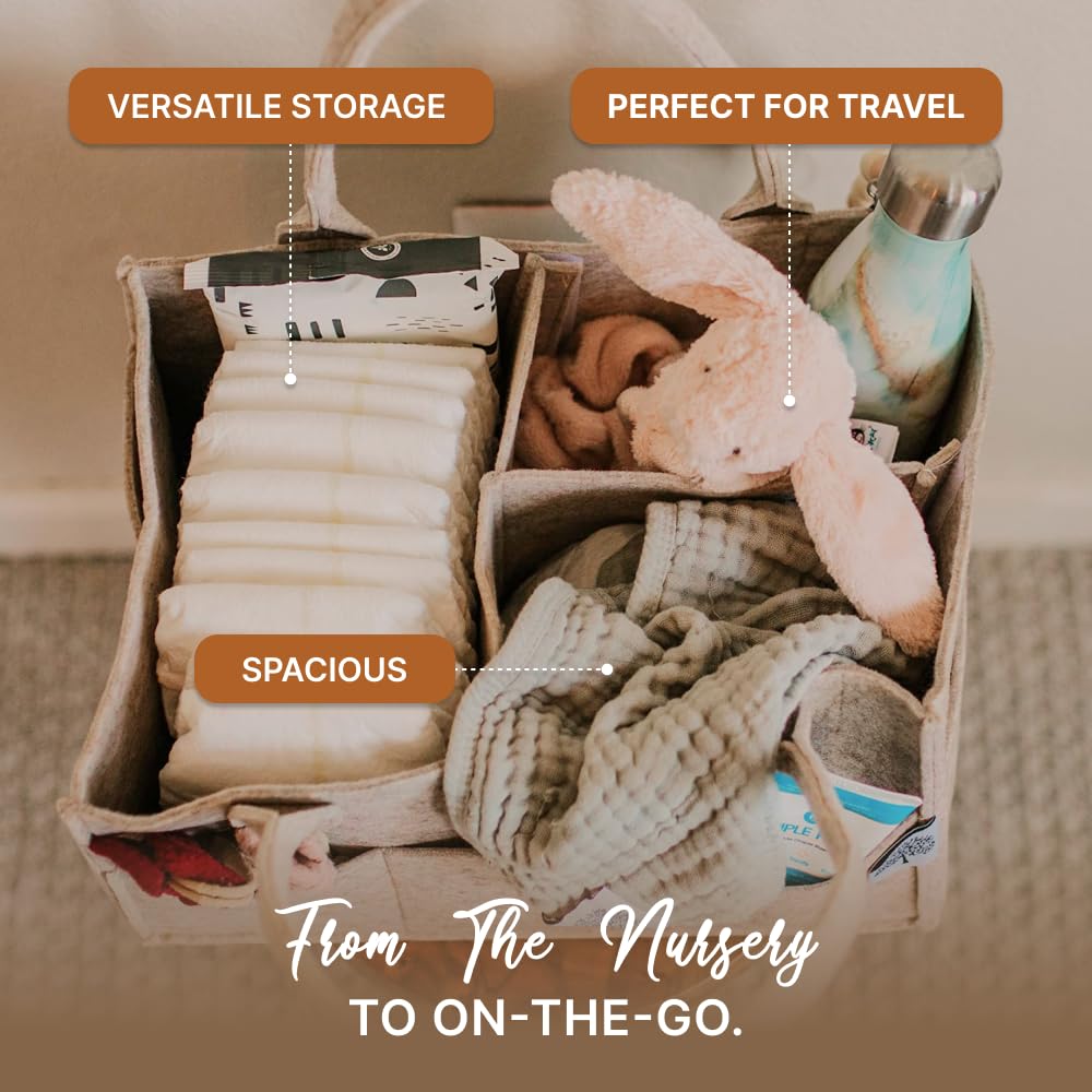 This diaper caddy is absolutely perfect for organizing all baby essentials. It’s spacious, well designed, and holds diapers, wipes, creams, bottles, and more with ease. The compartments keep everything neatly organized and easy to grab.The felt material is sturdy and high quality, and the neutral color looks great in the nursery and blends well with any décor. I also love the strong handles, which make it easy to carry from room to room.This is a must-have for new parents and also makes a great baby shower gift. Excellent quality and functionality—I highly recommend it!