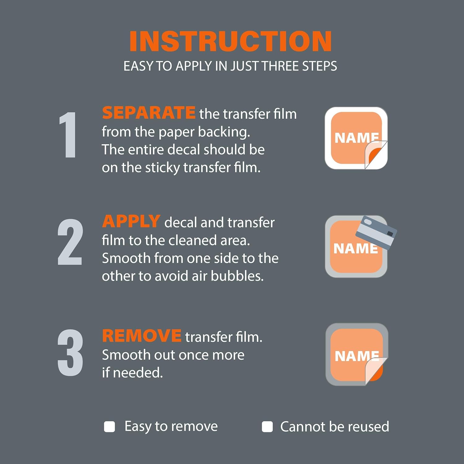Ordered a simple customized three letter decal for a piece of artwork. Decal arrived ahead of schedule. Package included the vinyl decal & scraper (used to smooth). No instructions. I asked RUFUS for the instructions, and received detail instructions and tips.Following the instructions; it was simple to remove the backing (1 of 3 layers). Placed the decal on the surface. My surface was not smooth as glass so I was patient. Smoothed and rubbed for about 10 minutes. Layer 2 is the actual decal. Removing layer 3 was a bit tedious but once I was able to get the film started it was simple. Pulled off layer 3 slowly watching to make sure edges adhered to the surface.My completed project was successful and looks beautiful. I will certainly order this product again.