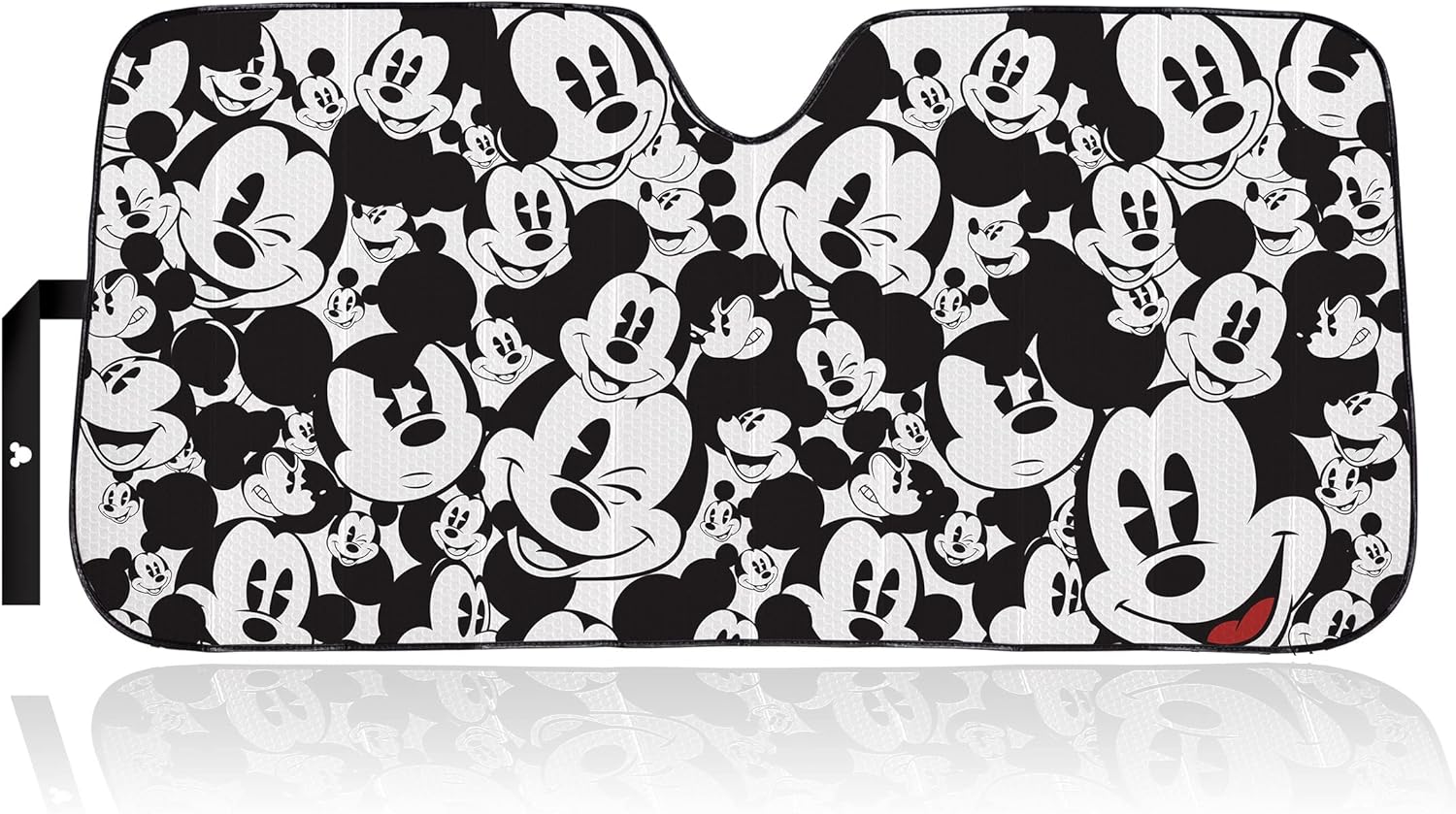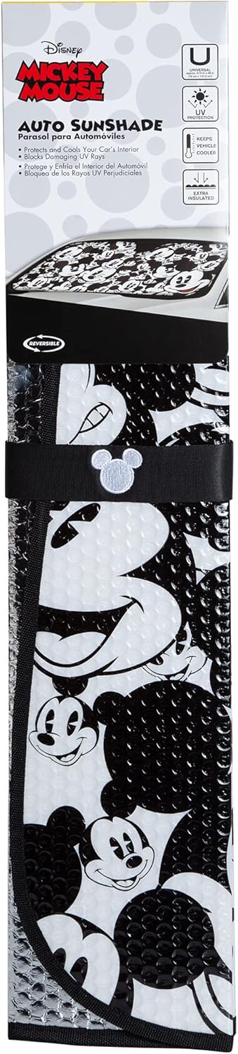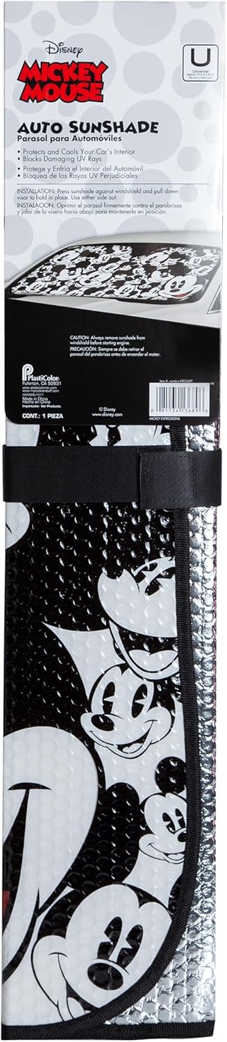 This officially licensed Mickey Mouse Expressions Windshield Sunshade by Plasticolor protects your vehicle interior from harmful UV rays while keeping cooler and showing off your style sense at the same time.