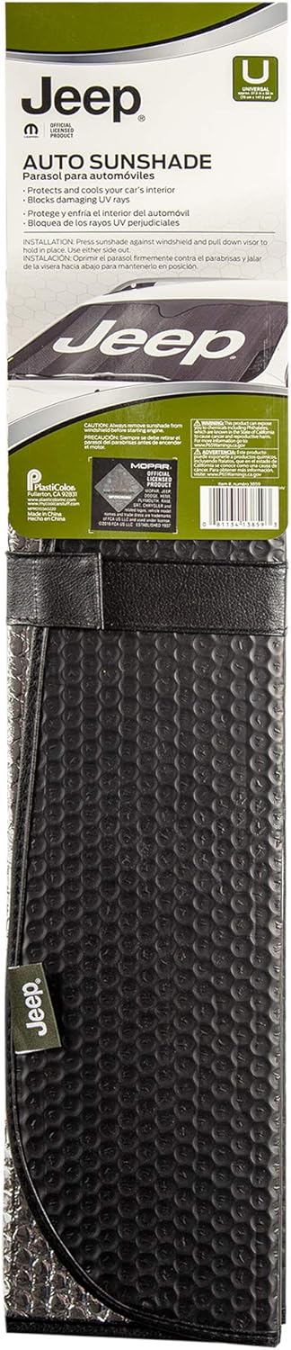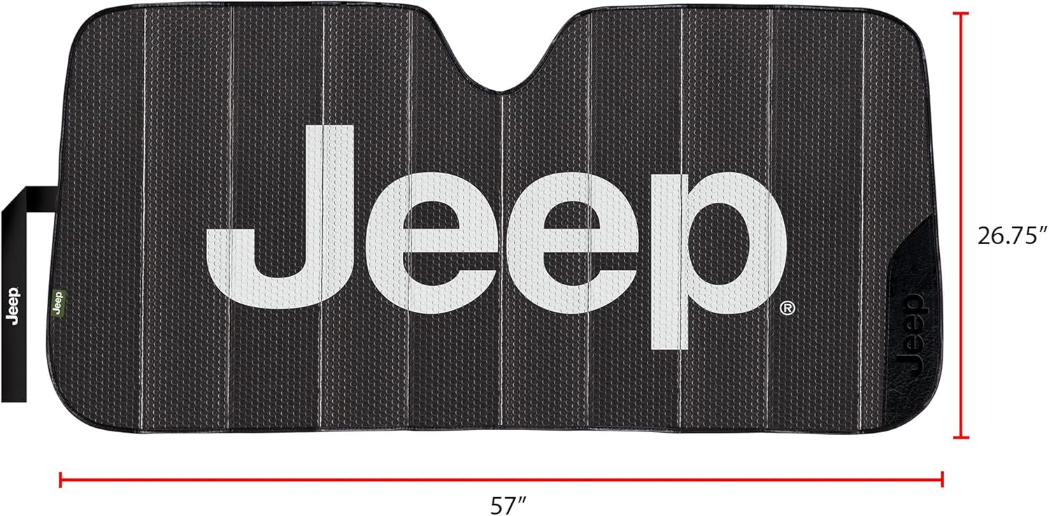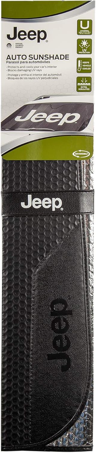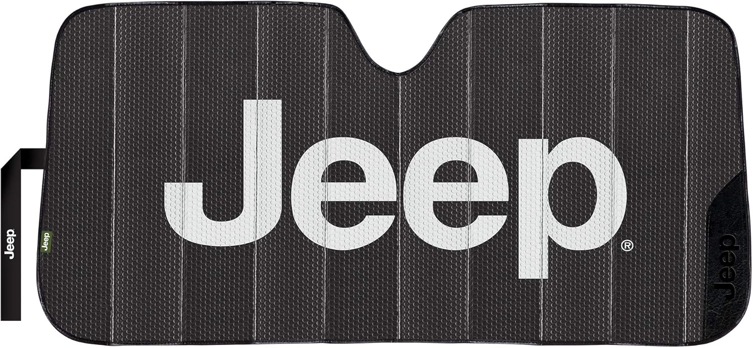 This Listing is for one (1) – 57-inch wide x 26.75-inch tall Jeep Black Matte Front windshield Sunshade. Officially licensed by Jeep. Add style to any windshield while protecting the vehicle’s interior from UV Rays, Sun Damage and Reduce Interior Heat Buildup when parked outdoors. Enjoy the bold and clear graphics that’s sure to make your personality stand out. This Sunshade will give your vehicle a fun, sporty, classy, and fashionable look everywhere it’s parked. Made of durable Bubble insulation with a reflective backing that is reversible for added protection all folded neatly away when not in use with an embroidered strap. This sunshade was designed to fit MOST vehicles; To ensure your satisfaction, measure your windshield first. DOES NOT FIT JEEP WRANGLER OR GLADIATOR MODELS.