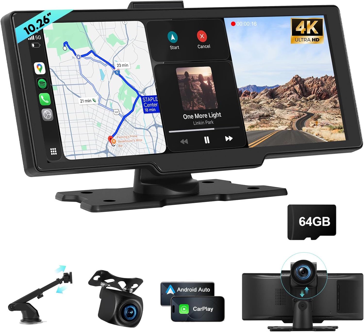 I really like this unit, it’s completely transformed my driving experience. The 10″ touchscreen is large and super easy to navigate. I use Android Auto with my Samsung phone, though it has the option to connect iPhones. I went with Bluetooth for my connection, but wireless is also an option. I love the hands-free operation with voice commands like Hey Google (Siri too), and I’m constantly using Google Maps or Waze for navigation.What really impressed me are the cameras. There’s a 4K dash cam built right in and a 1080p rear camera. It came with a 64GB micro SD card already installed, which is nice. The G-sensor feature gives me peace of mind since it automatically saves footage if I’m ever in an accident. The card records on a loop, so I never have to worry about running out of space. The rear camera cable is 25 feet long, which worked perfectly for my setup.I haven’t tried the streaming features yet (Apple AirPlay or Android Cast), but I like knowing they’re there. The unit has its own speaker, but I connected it through my car’s audio system instead. The display quality is superb, and I found the settings menu really intuitive. I especially appreciate the multiple split-screen options.For the price and everything you get, I think this is an excellent choice.