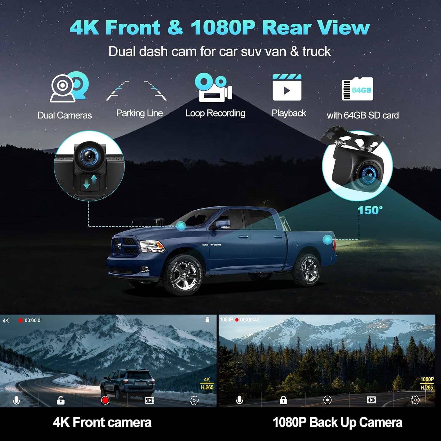 【4K Front Dash Cam & 1080P Rear Camera & 64GB SD card】 This CarPlay screen is equipped with a 4K dashcam and a 1080P backup camera, with 150° wide-angle views and built-in 64GB SD card. It supports loop recording & playback, built-in G-sensor that automatically saves emergency video in case of collision. The front dashcam supports up-and-down adjustment, and the rearview camera with a 26ft extension cable, making this CarPlay screen for car with dashcam suitable for most vehicle models.