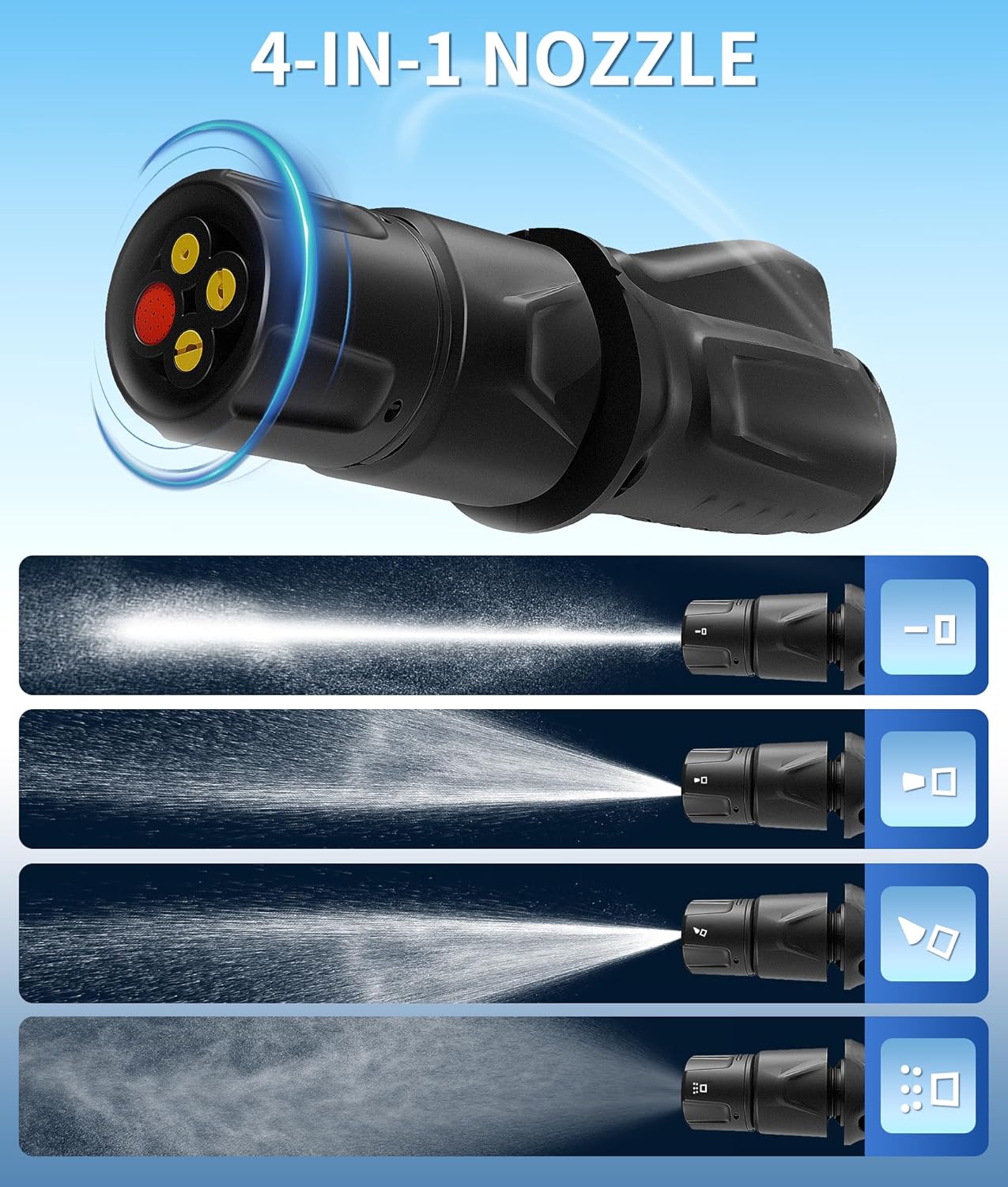 Multiple Pressure Settings For Different Tasks in One Second: New version 4-in-1 nozzle effortlessly switch between four modes (0°, 45°, spray, and brush) at the push of a button.