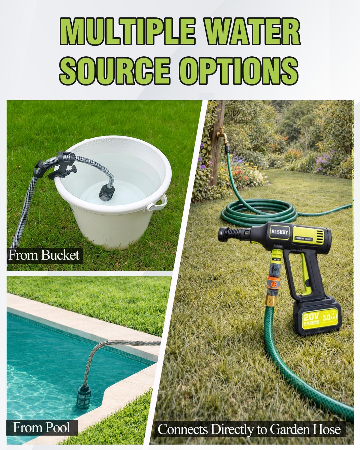 LIGHTWEIGHT & PORTABLE CLEANING ANYWHERE: This battery pressure washer includes a 16.4 ft suction hose with weighted filter, allowing water to be drawn from buckets, pools, or lakes. It also supports direct connection to a standard garden hose, making it highly flexible for indoor and outdoor cleaning