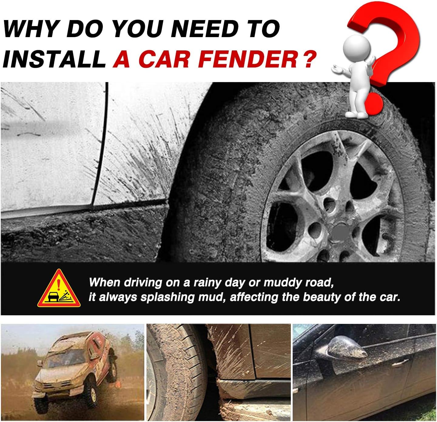 【Ultimate Defense】Equipped with splash guards, your car is fortified against scratches, abrasions, and harm caused by flying mud and debris. They act as a barrier, deflecting dirt and gravel, thus mitigating noise, protecting the engine from impacts, and preserving your vehicle’s pristine condition.